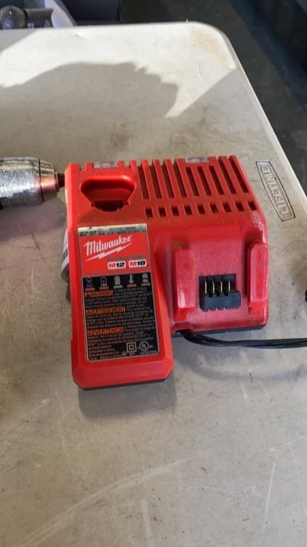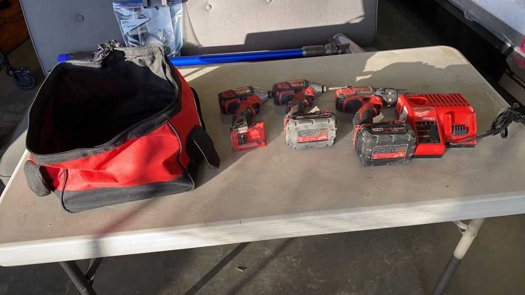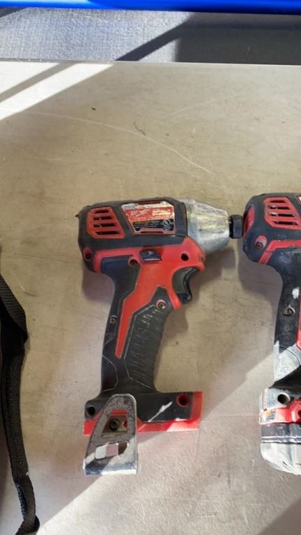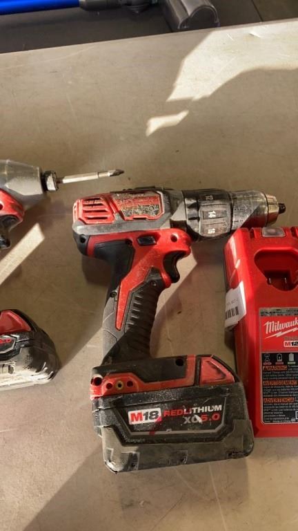 MILWAUKEE M18 CORDLESS TOOL SET - 2 IMPACT GUNS, HAMMER DRILL, 2 BATTERIES AND CHARGER - TESTED AND WORKING