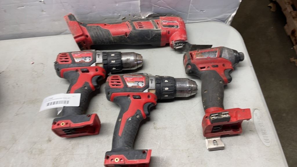 MILWAUKEE M18 CORDLESS TOOL SET, INLCUDES MUTI TOOL, 2 HAMMER DRILLS, FUEL BRUSHLESS IMPACT GUN, RED