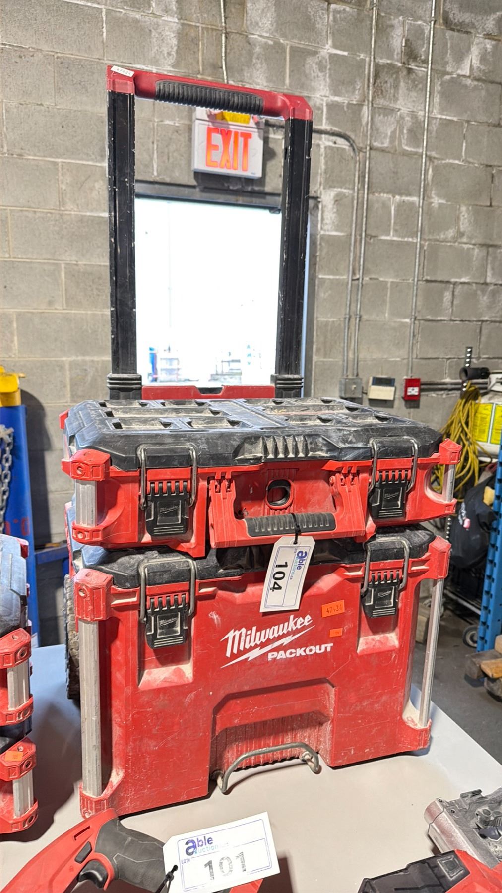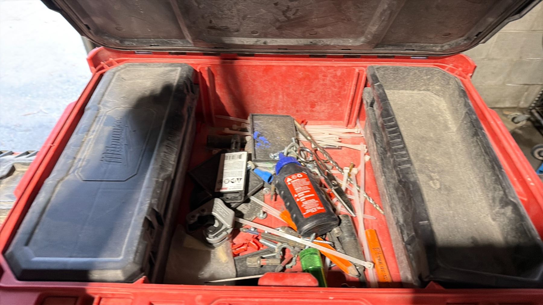 MILWAUKEE PACKOUT PORTABLE MOBILE TOOL BOX BASE WITH MILWAUKEE PACKOUT PORTABLE TOOL BOX & ASSORTED CONTENTS