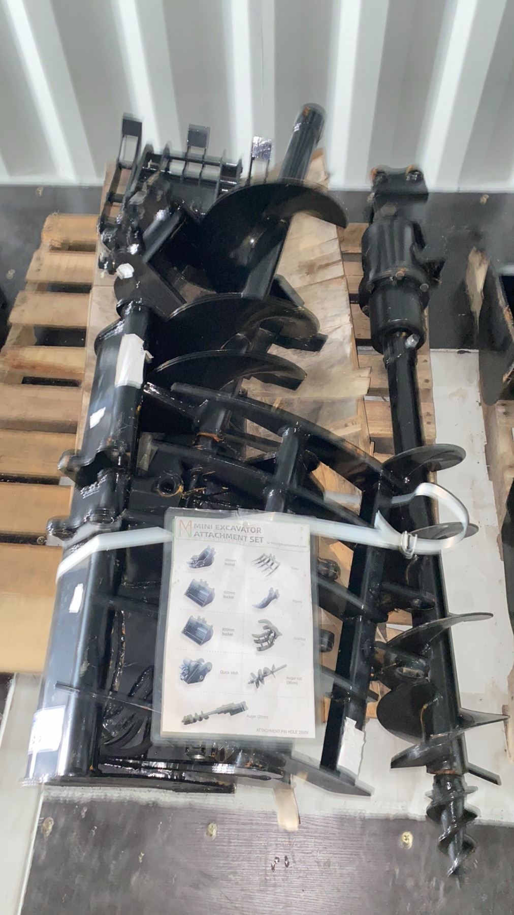 MINI EXCAVATOR ATTACHMENT SET INCLUDES: 200MM BUCKET, 500MM BUCKET, 800MM BUCKET, QUICK HITCH, RAKE, RIPPER, GRABBER, AUGER ROD (30CM) & AUGER (20CM) ATTACHMENT PIN HOLE: 25MM