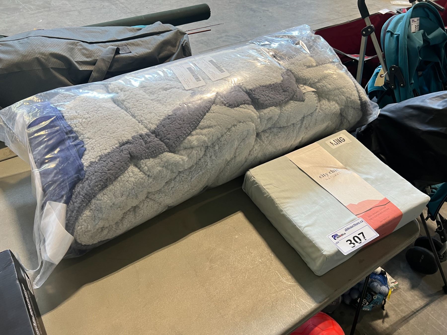 MINT CITY CHIC NATURAL KING SIZE SHEET SET WITH A GREY AND BLUE UGG BLANKET