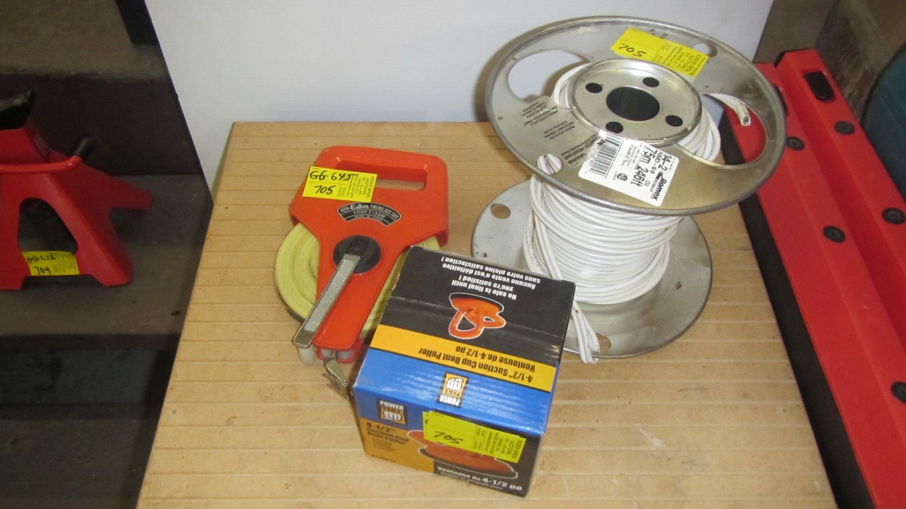 MISC. 100' TAPE MEASURE, SUCTION CUP & SM ROLL OF WIRE