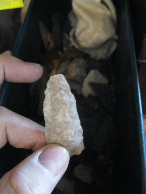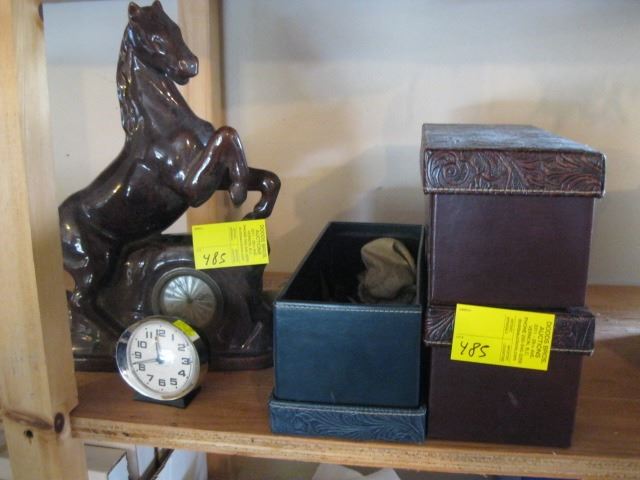 MISC. BOXES WITH ARROWHEADS, HORSE CLOCK, ETC.