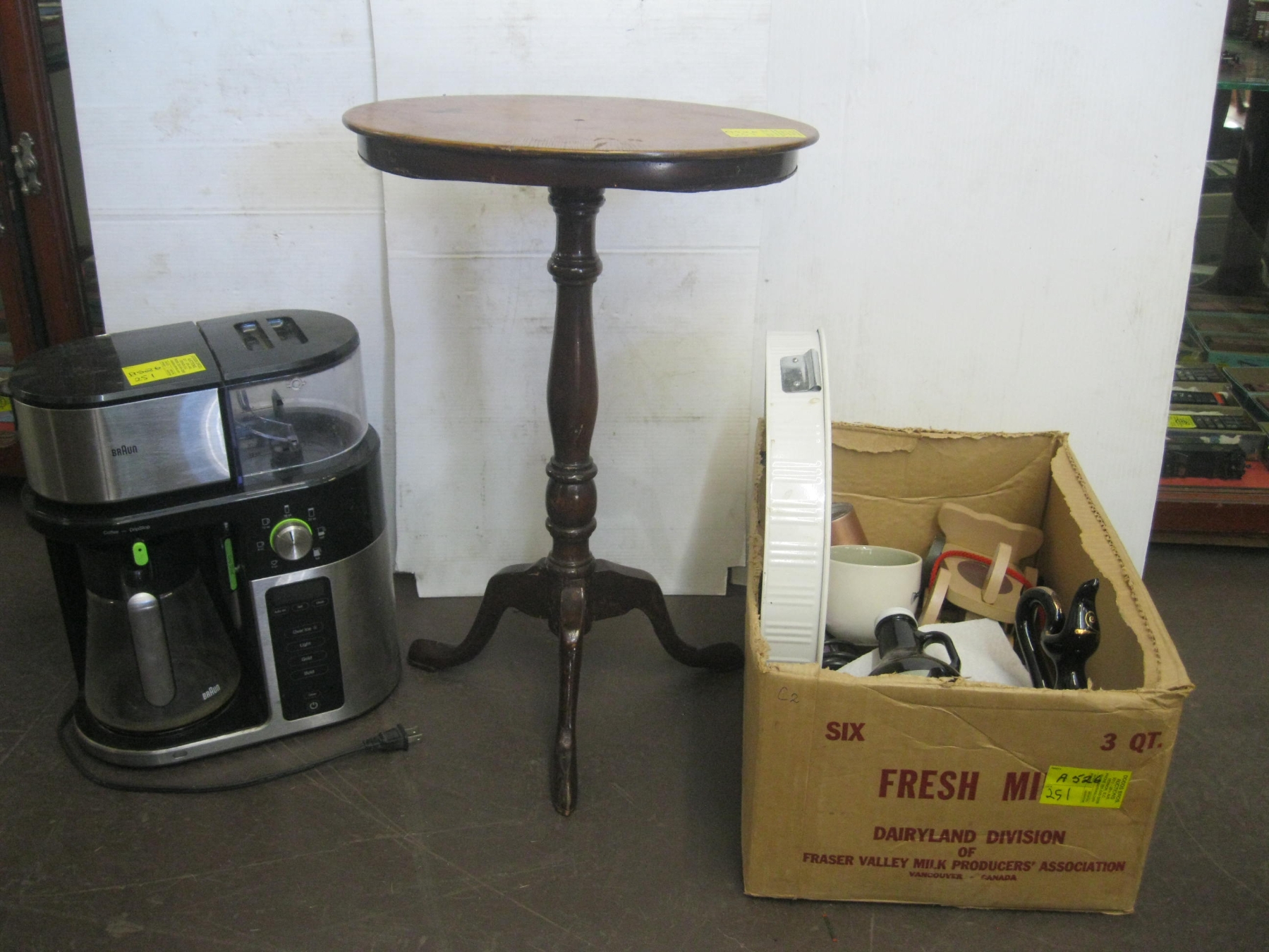 MISC. COFFEEMAKER, SMALL ANTIQUE TABLE