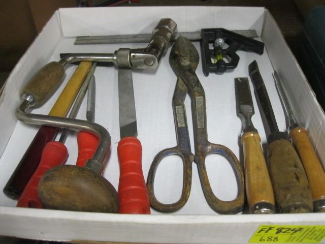 MISC. HAND DRILLS, CHISELS, TIN SNIPS, ETC.