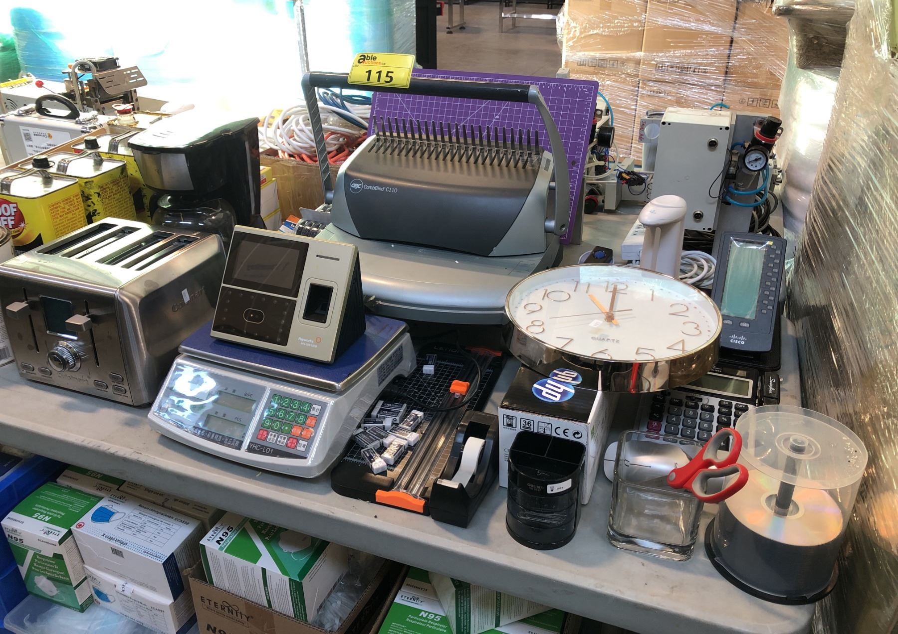 MISC.ITEMS INCLUDING COFFEE MACHINE, TOASTER, GBC COMBBIND C110 BINDING MACHINE, 4 HALF CANS OF GOOF OFF, CISCO SPA500DS SIDECAR EXPANSION MODULE, HP M1536/P1566/P1606 BLACK TONER, CLOCK, SCALE, PAPER CUTTER AND MORE