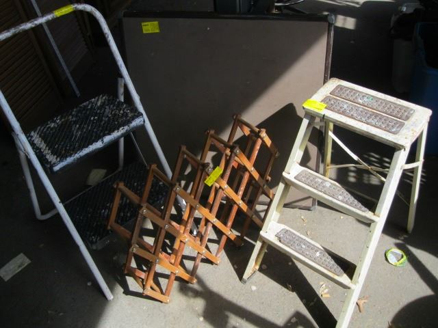 MISC. LADDERS, FOLDING TABLE, WINE RACK