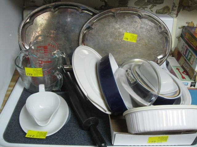 MISC. MEASURING CUPS, BAKING DISHES, ROLLING PIN, ETC.