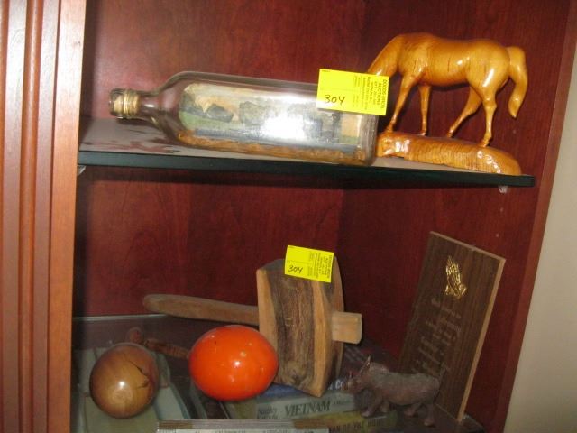 MISC. WOODEN HORSE, SHIP IN A BOTTLE, MALLOT, ETC.