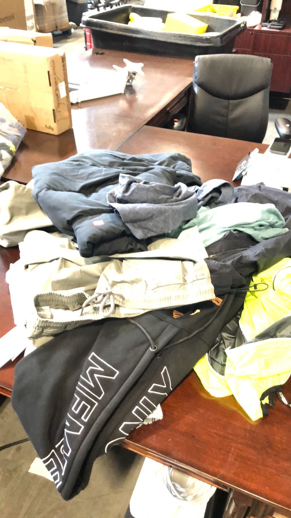 MIXED CLOTHING INCL MEMBERS ONLY SWEATER W/ HOOD, PANTS, SHIRTS, PUFFY VEST AND MORE