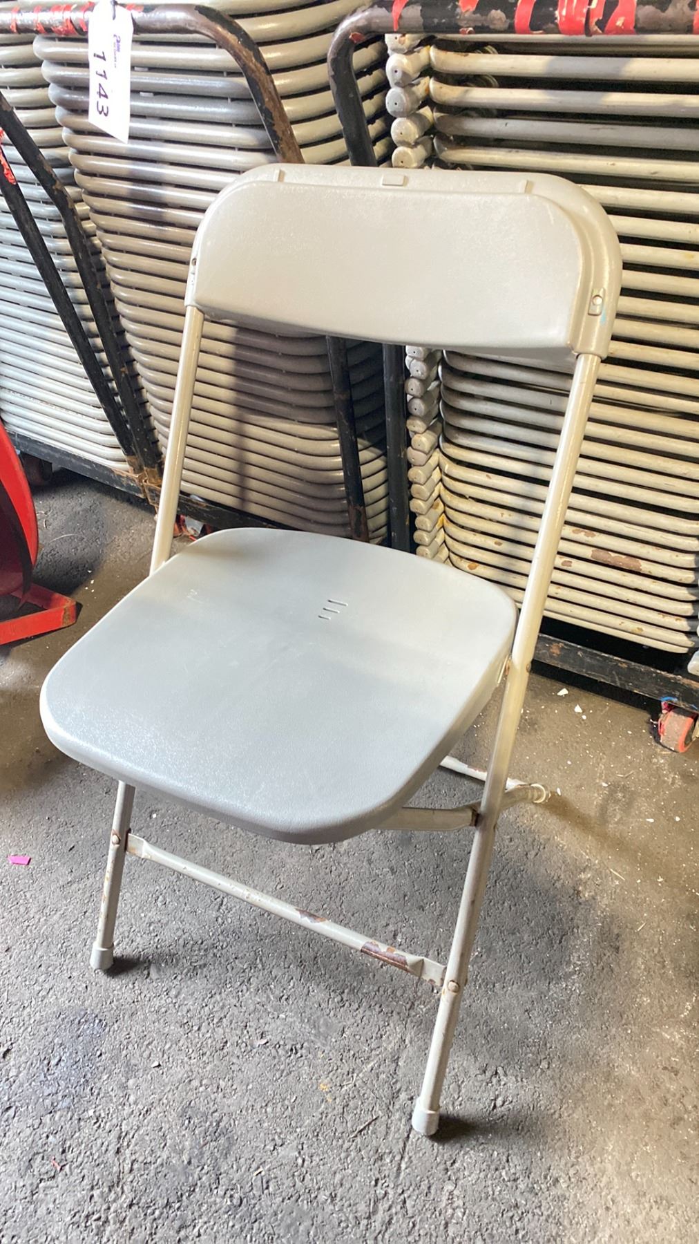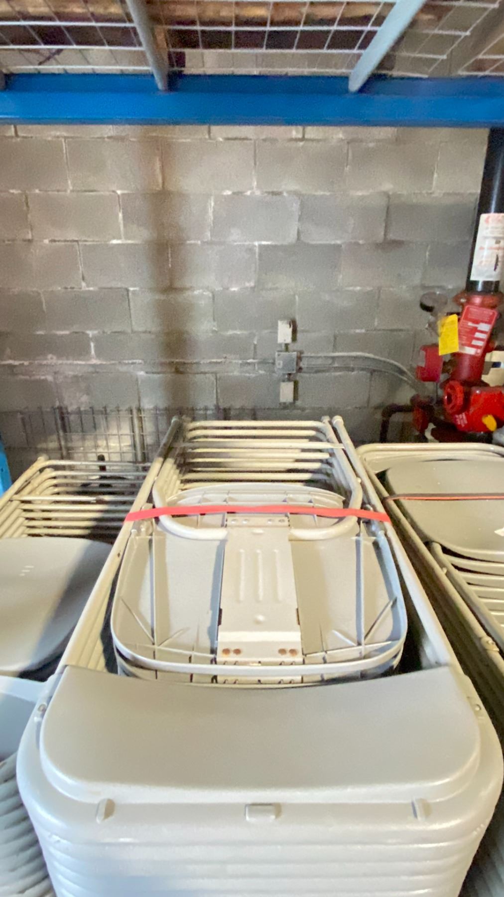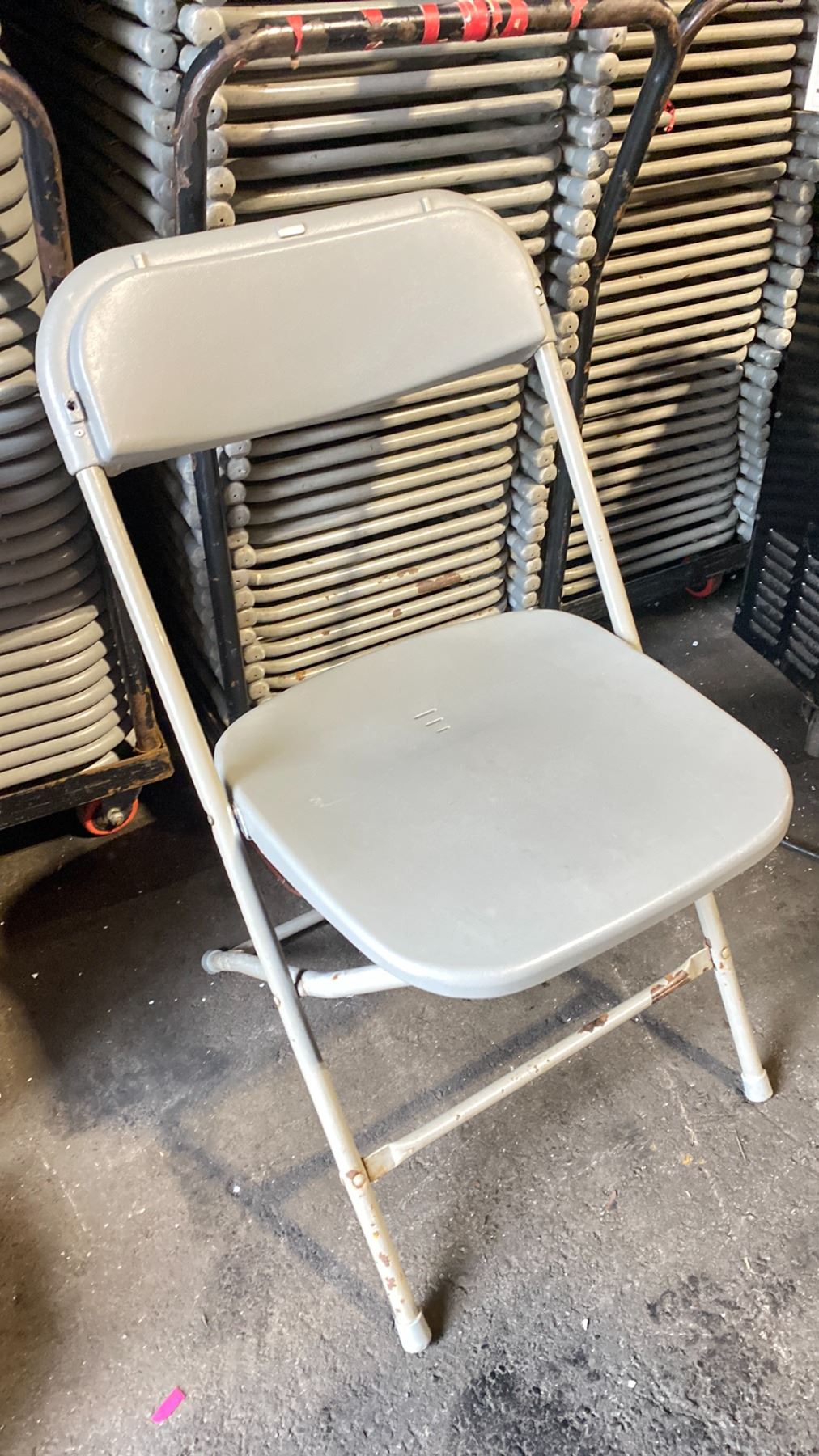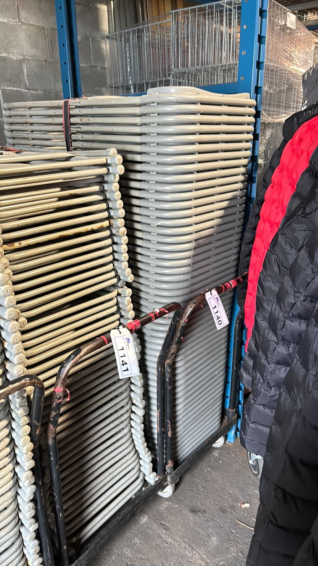 MOBILE CART OF 52 GREY PLASTIC/METAL FRAMED FOLDING STACKING EVENT CHAIRS *CART INCLUDED*