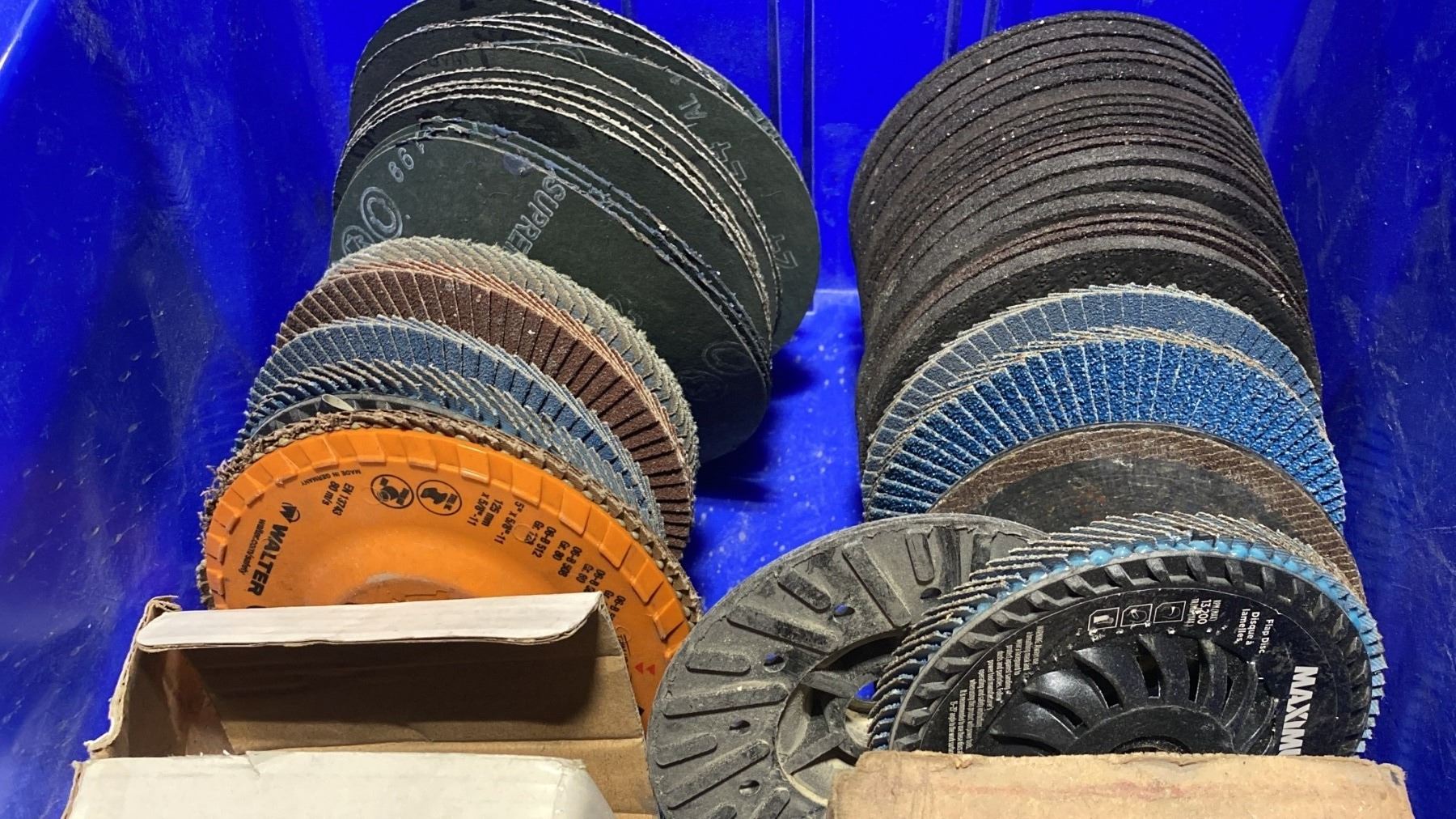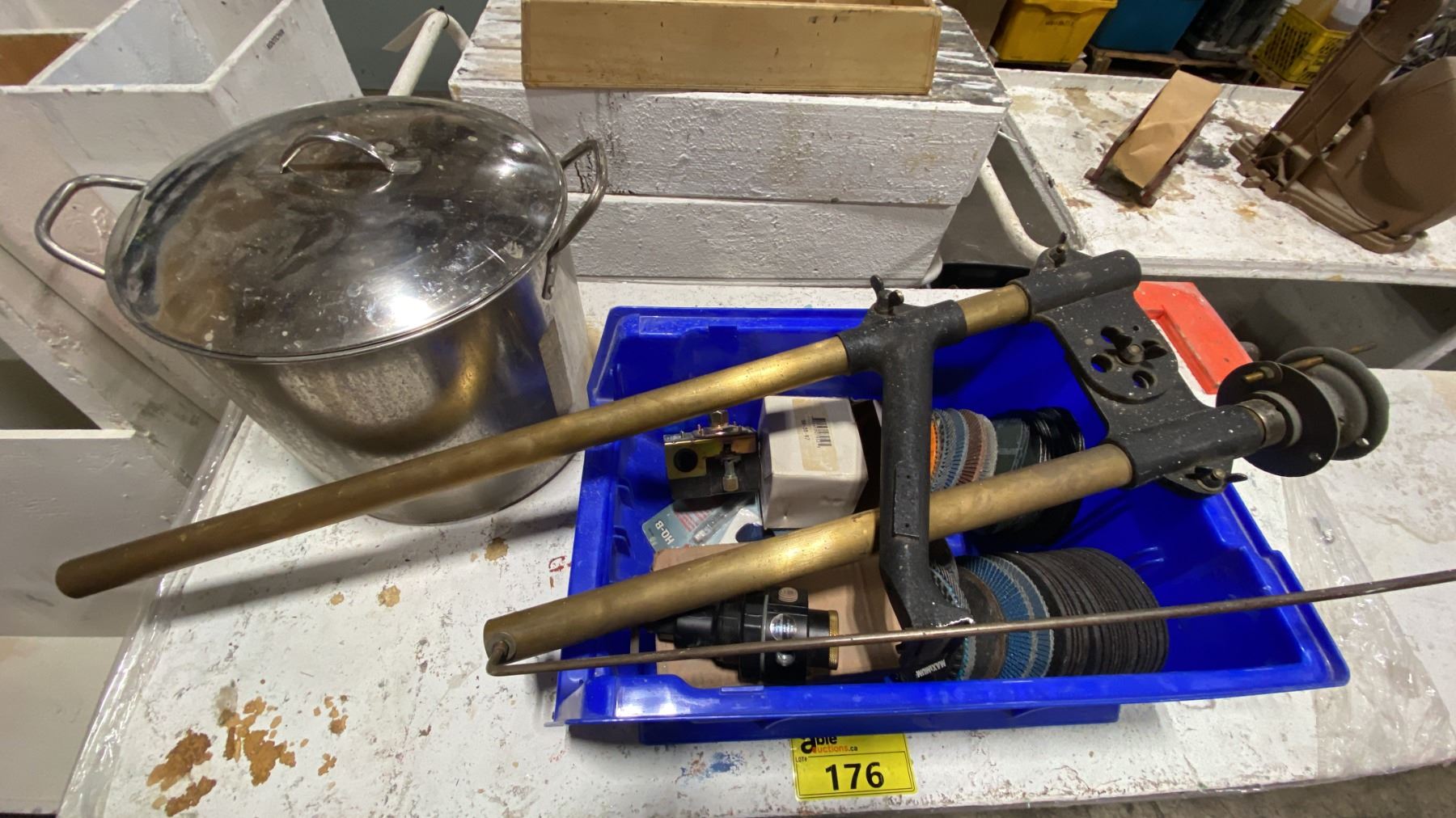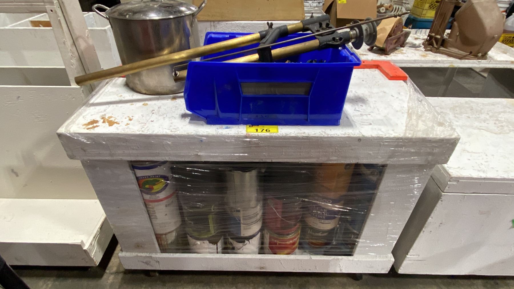 MOBILE STORAGE TABLE WITH ASSORTED PAINTS, STOCK POT, ASSORTED PARTS & GRINDING/SANDING DISCS