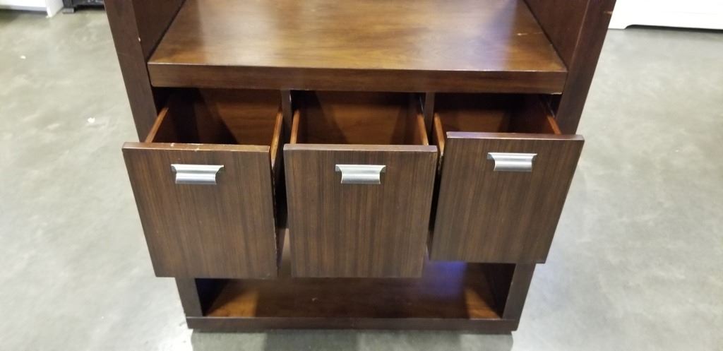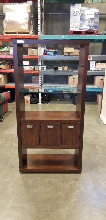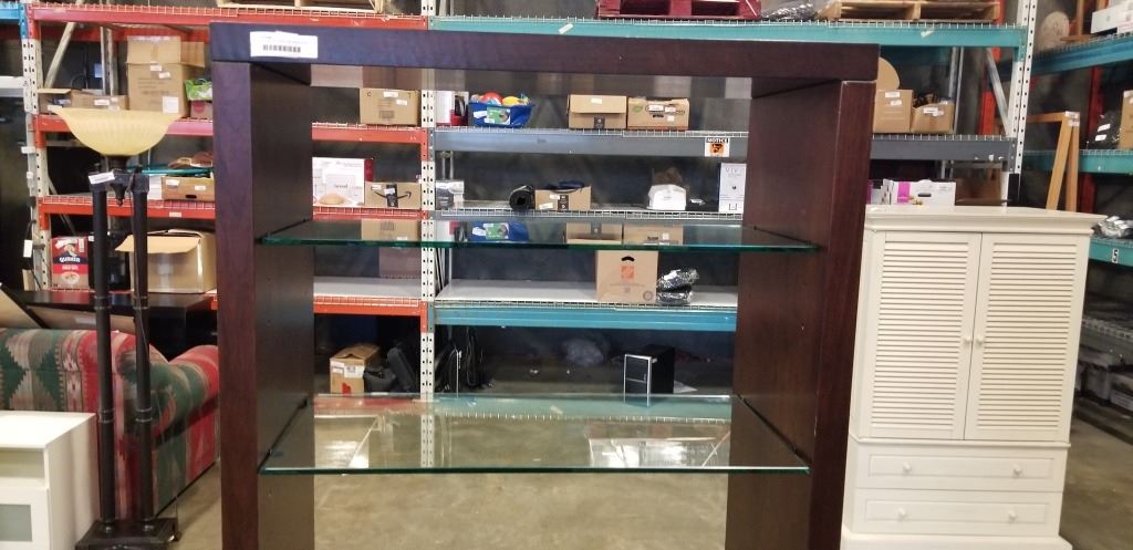 MODERN DISPLAY SHELF UNIT WITH GLASS SHELVES, 36 INCH WIDE, 6FT TALL , DOUBLE SIDED