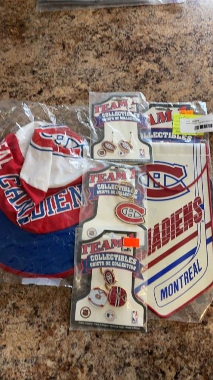 MONTREAL CANADIANS TEAM COLLECTIBLES FLAGS, PINS, EARRINGS, KEYCHAIN, HAT