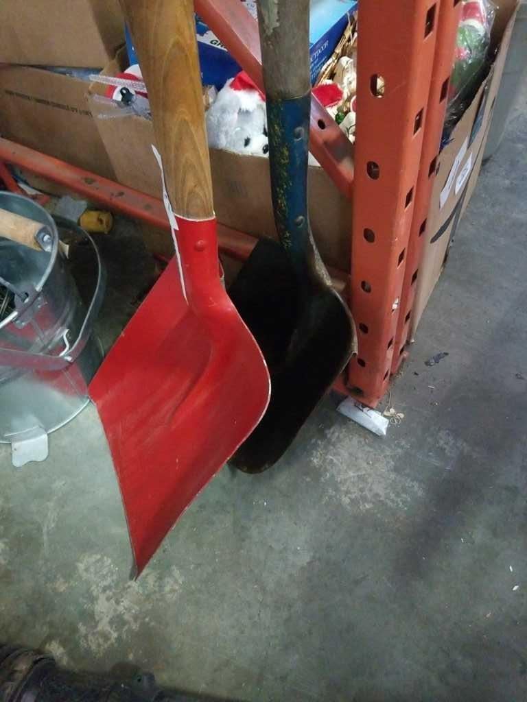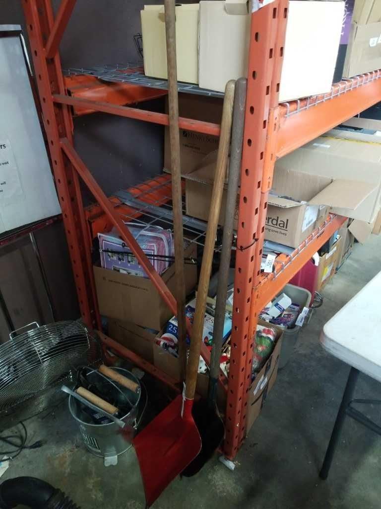 MOP BUCKET, 2 SHOVELS AND RAKE