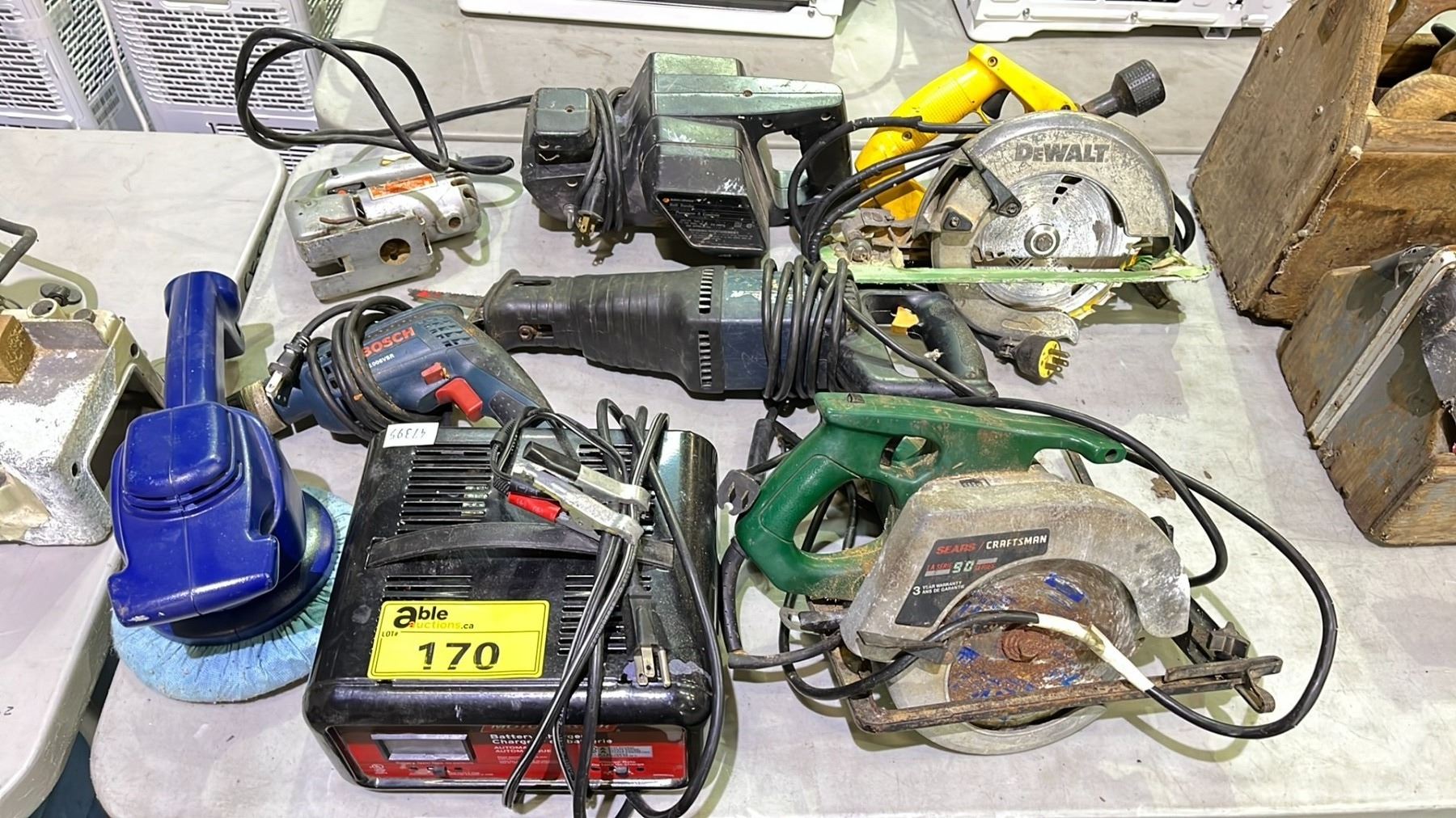 MOTOMASTER BATTERY CHARGER, CRAFTSMAN ELECTRIC CIRCULAR SAW, DEWALT ELECTRIC CIRCULAR SAW, ELECTRIC SAWZALL, ELECTRIC SANDERS & STAPLER