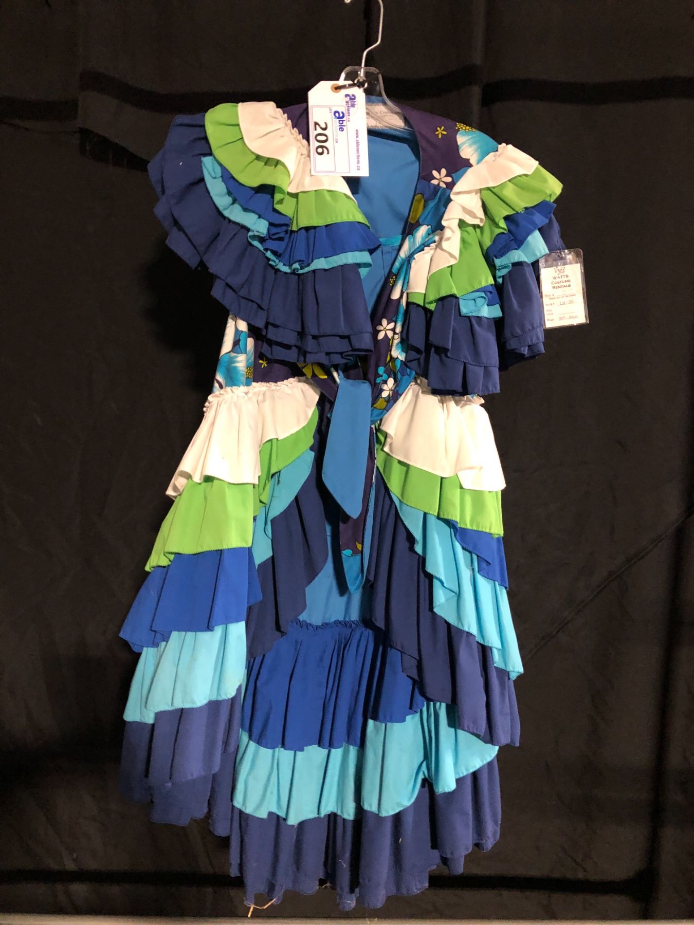 MULTI-COLOURED SPANISH STYLE DRESS, DAILY RENTAL $100.00