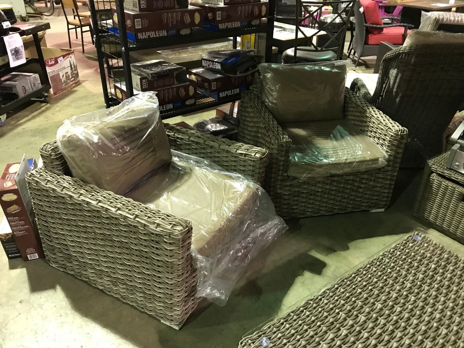 MY PATIO 4 PCS PLASTIC RATTAN OUTDOOR CONVERSATION SET WITH BROWN CUSHIONS INCLUDING: 3 SEAT SOFA, 2 ARM CHAIRS & COCKTAIL TABLE WITH GLASS SOFA - 6' X 3' , CHAIRS - 33" X 34" , TABLE - 38" X 22" MSRP $3,800
