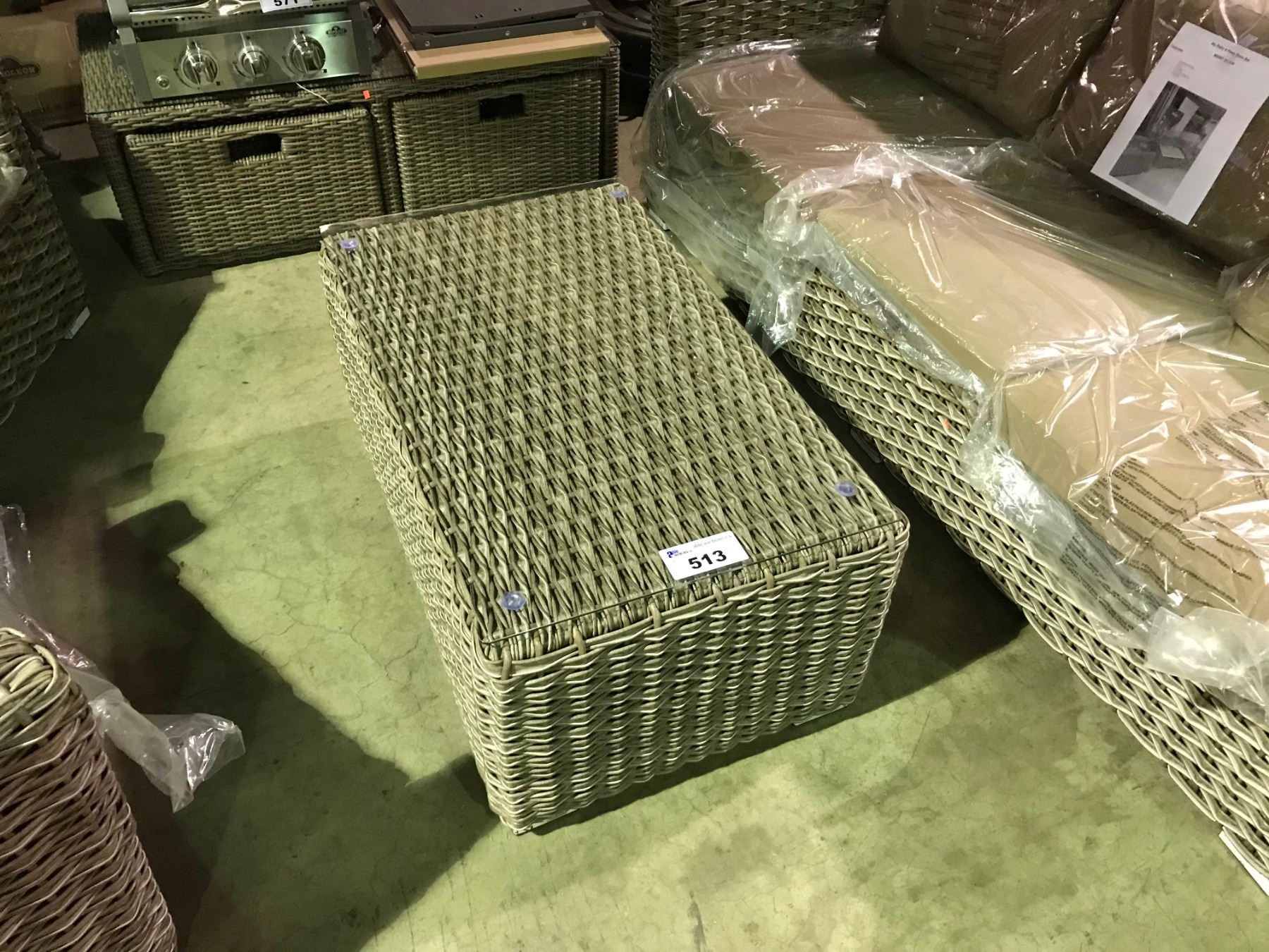 MY PATIO 4 PCS PLASTIC RATTAN OUTDOOR CONVERSATION SET WITH BROWN CUSHIONS INCLUDING: 3 SEAT SOFA, 2 ARM CHAIRS & COCKTAIL TABLE WITH GLASS SOFA - 6' X 3' , CHAIRS - 33" X 34" , TABLE - 38" X 22" MSRP $3,800