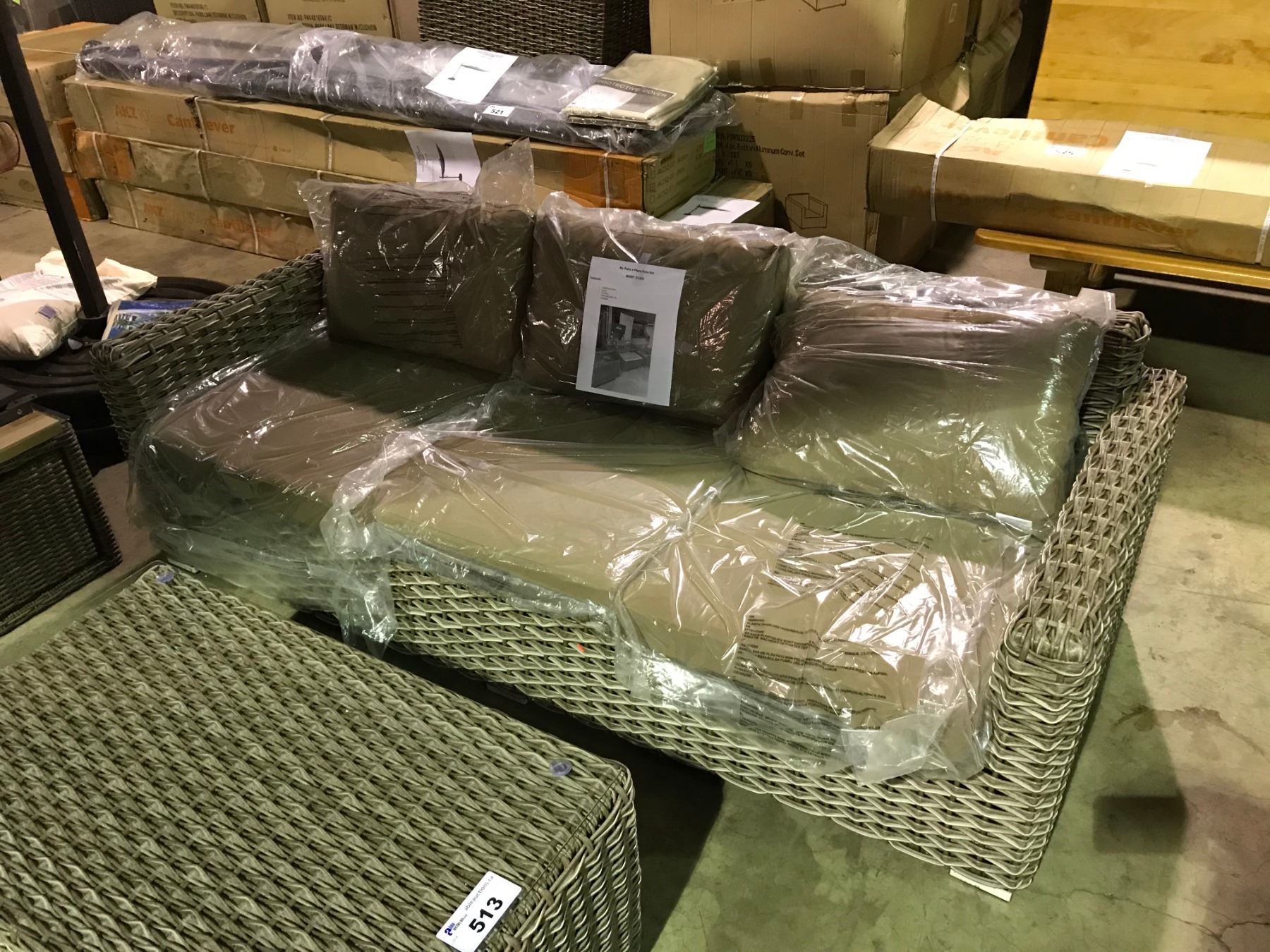MY PATIO 4 PCS PLASTIC RATTAN OUTDOOR CONVERSATION SET WITH BROWN CUSHIONS INCLUDING: 3 SEAT SOFA, 2 ARM CHAIRS & COCKTAIL TABLE WITH GLASS SOFA - 6' X 3' , CHAIRS - 33" X 34" , TABLE - 38" X 22" MSRP $3,800