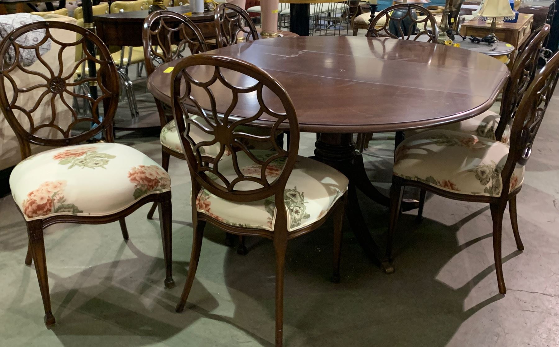 Mahogany Pedestal Dining Table & 7 Web Back Chairs (Table 54" round with 20" leaf )