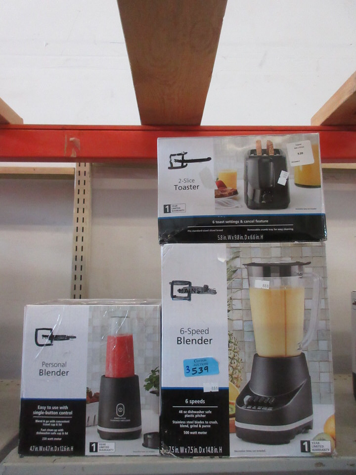 Black. 48 oz. dishwasher safe plastic pitcher blender. Personal blender with travel cup. 6 Settings toaster. Customer returns. As is.