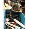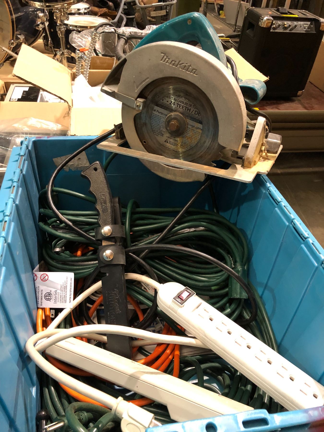 Makita circular saw/ assorted extension cords & power bars/ fisherman's fillet knives & blue plastic storage tote