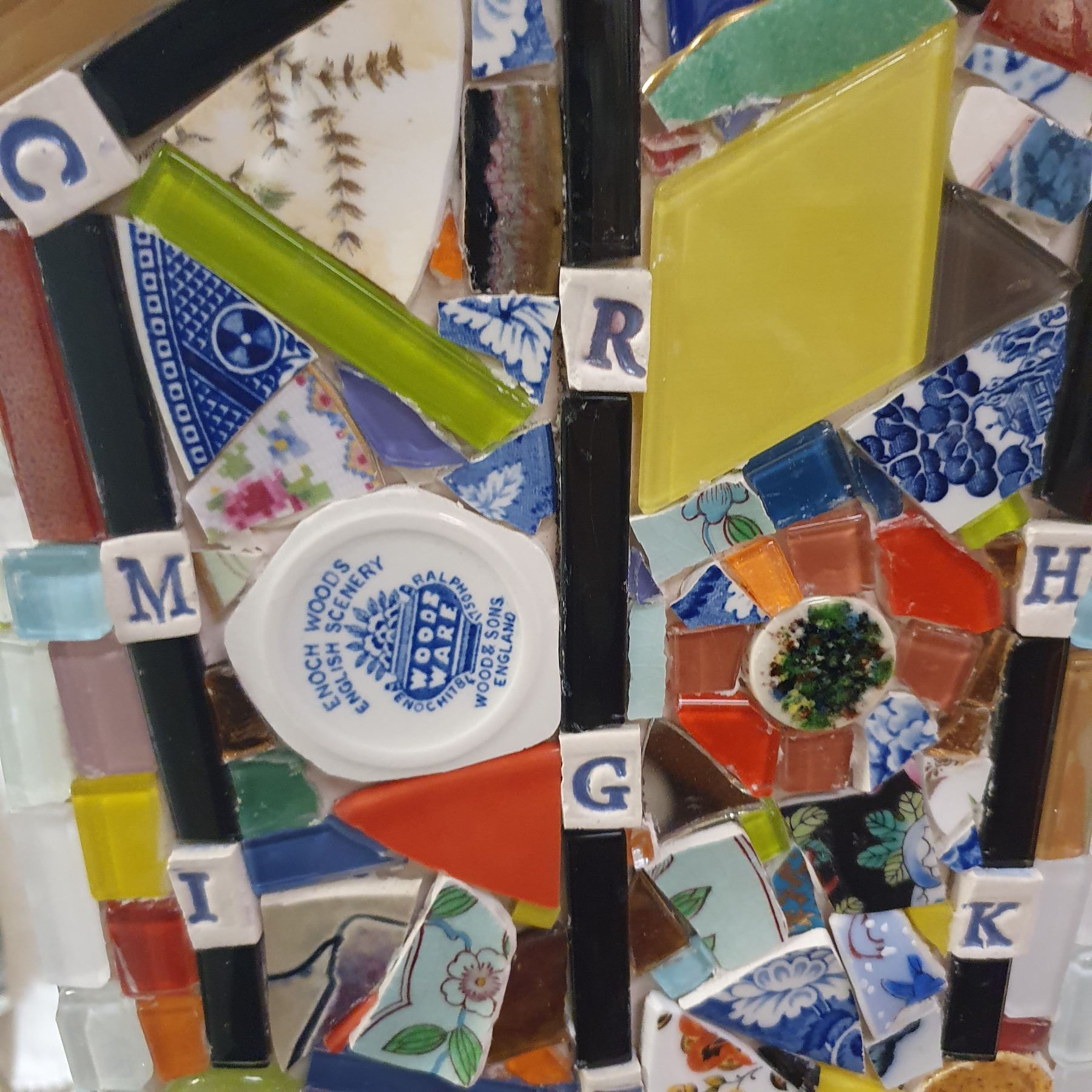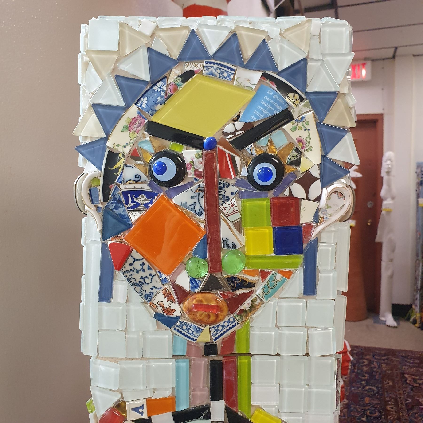 Male Point of View 2016 w/Ceramic, ceramic and glass tiles, shards, with metal base and rod (Michener, Sally