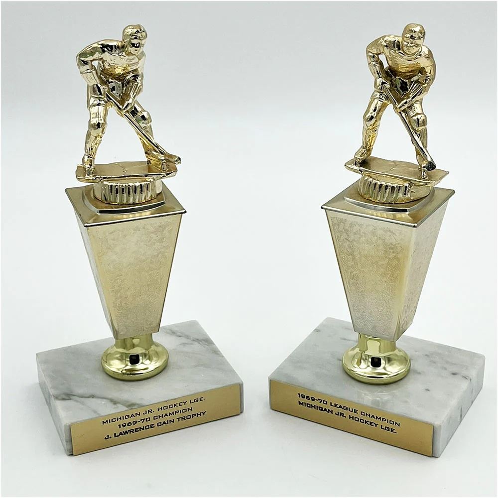 Before his successful WHA and NHL career, Marty Howe was a phenom in youth/junior hockey. These trophies were awarded to him and his team for their 1969-70 Michigan Jr. Hockey League Championship. They each stand 9" tall.