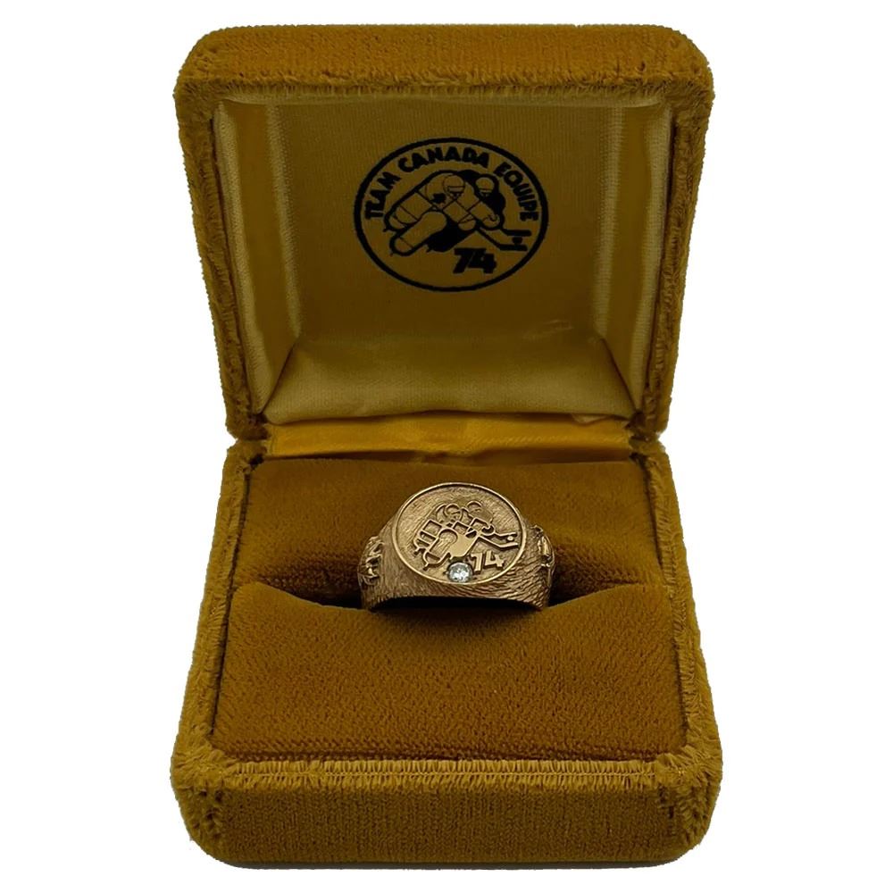 This beautiful 10kt yellow-gold ring was gifted to Marty Howe in honor of his selection to Team Canada of the 1974 Summit Series. The 1974 Summit Series was an eight-game series that followed up on the success of 1972 Summit Series. However, instead of NHL stars, this version of Team Canada was made up of players from the World Hockey Association. Marty Howe as well as his legendary father Gordie and brother Mark were all selected to represent Canada. The size 10 ring displays the 74 logo with .20ct full-cut diamond on the head. The shoulders each display a logo of the competing nations. It comes complete with original case. Very rarely are keepsakes such as this made available for public sale