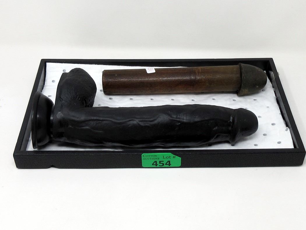 Black dildo has a suction cup base. 10" wood dildo has a metal cap. We won't judge.