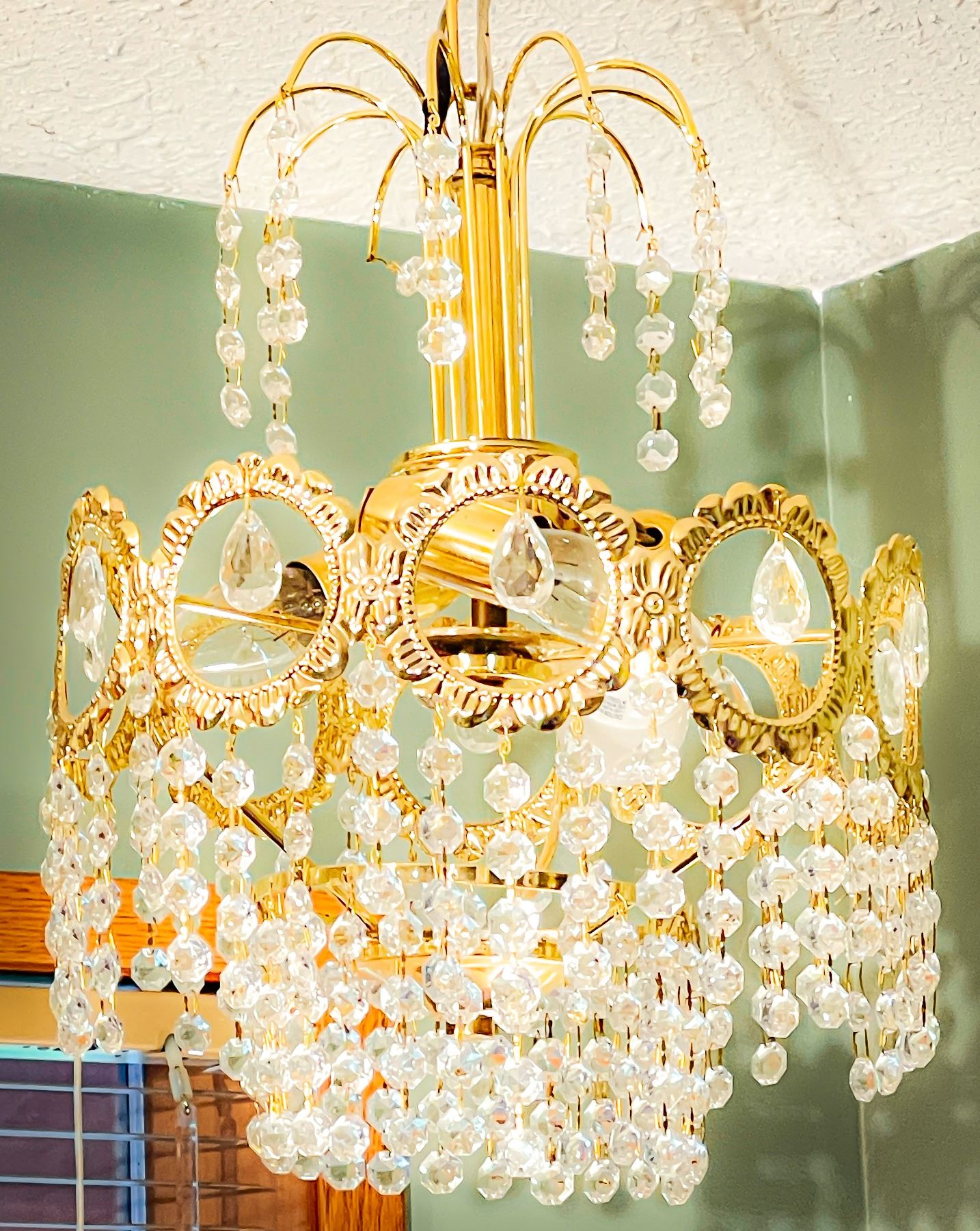 Matching pair of stunning vintage Hollywood Regency chandeliers featuring ornate gold-tone metal frames with cascading crystal prisms and teardrop accents. Elegant mid-century glam design that sparkles beautifully when lit. In excellent vintage condition - wiring should be checked before hanging.