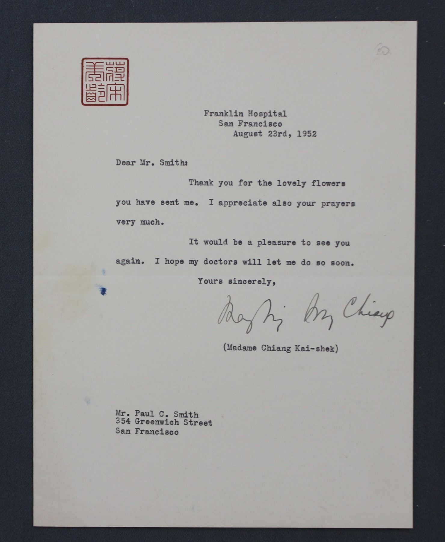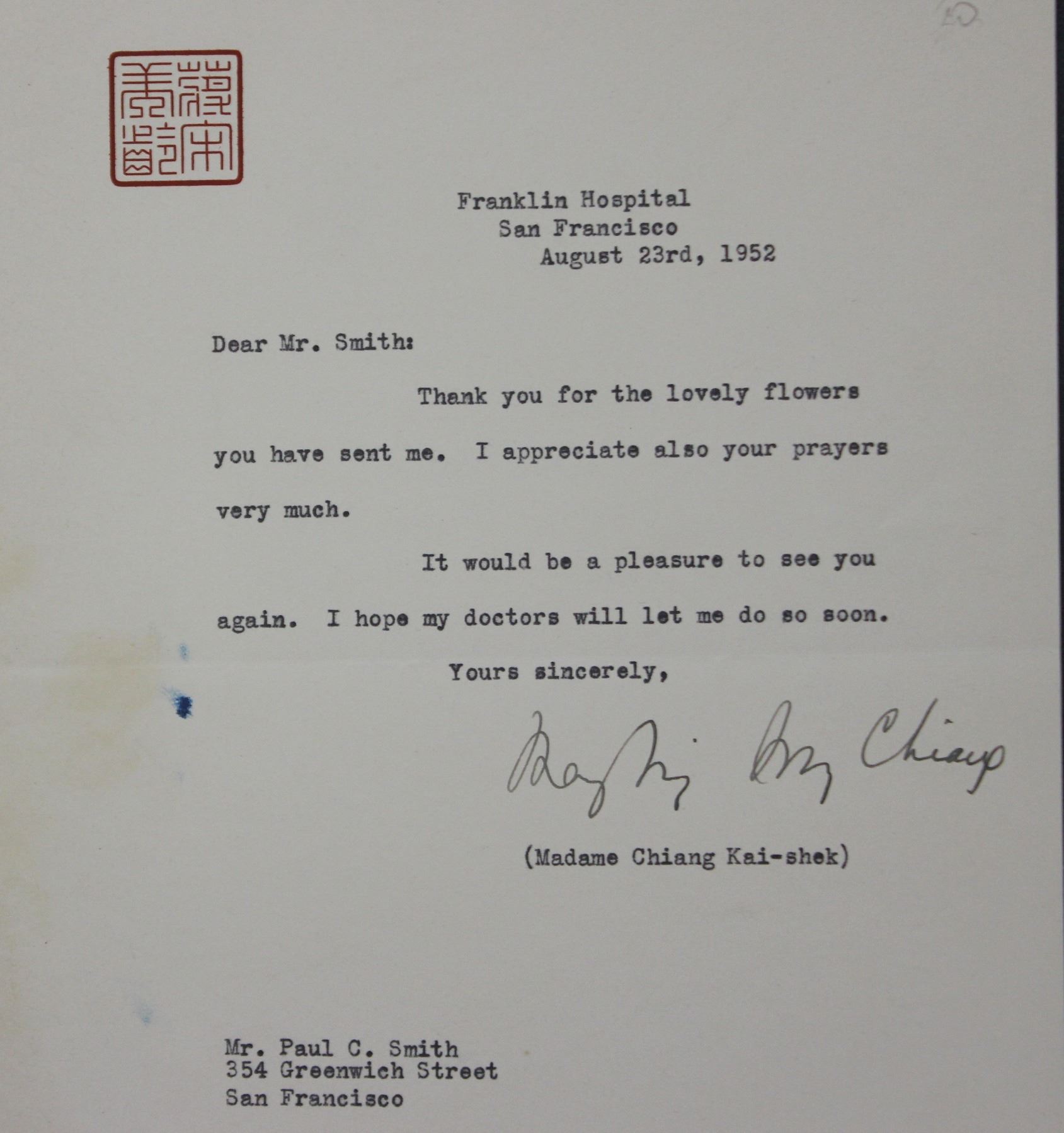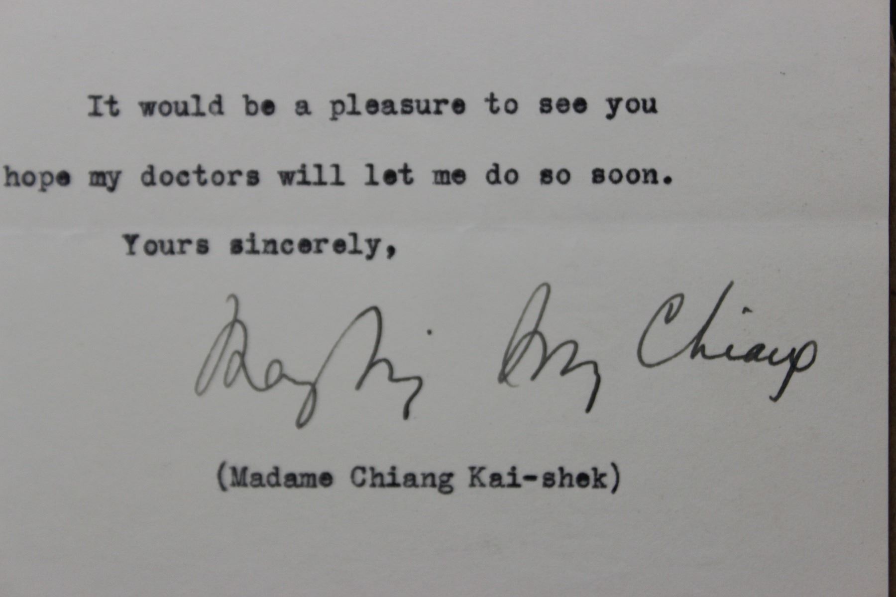 Mdme. Chiang Kai-shek (Soong Mei-ling) Letter Signed on Personal Letterhead. One page, 8 3/4" x 6 1/2"; Aug. 23, 1952.
