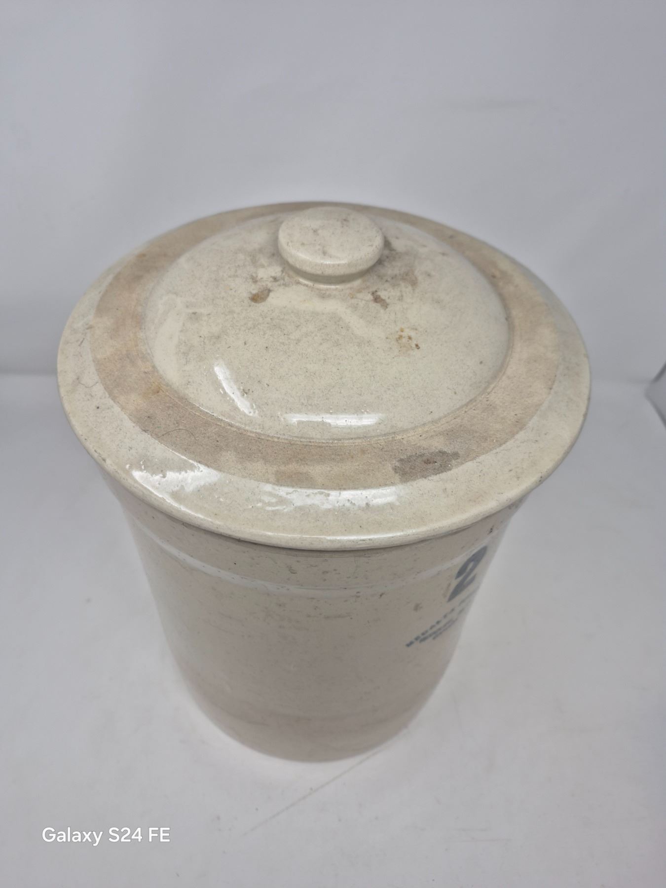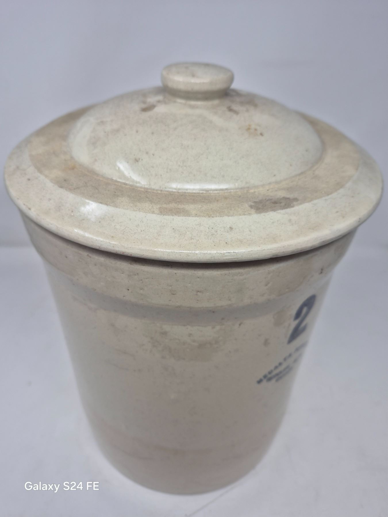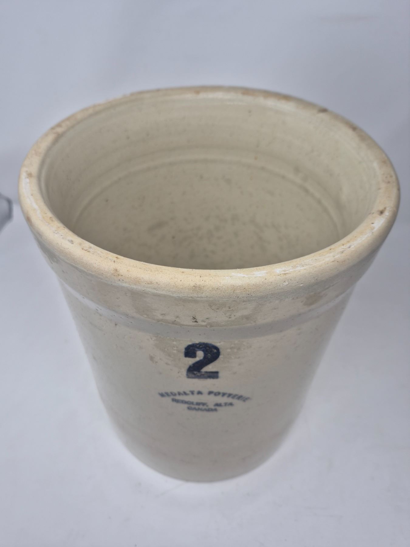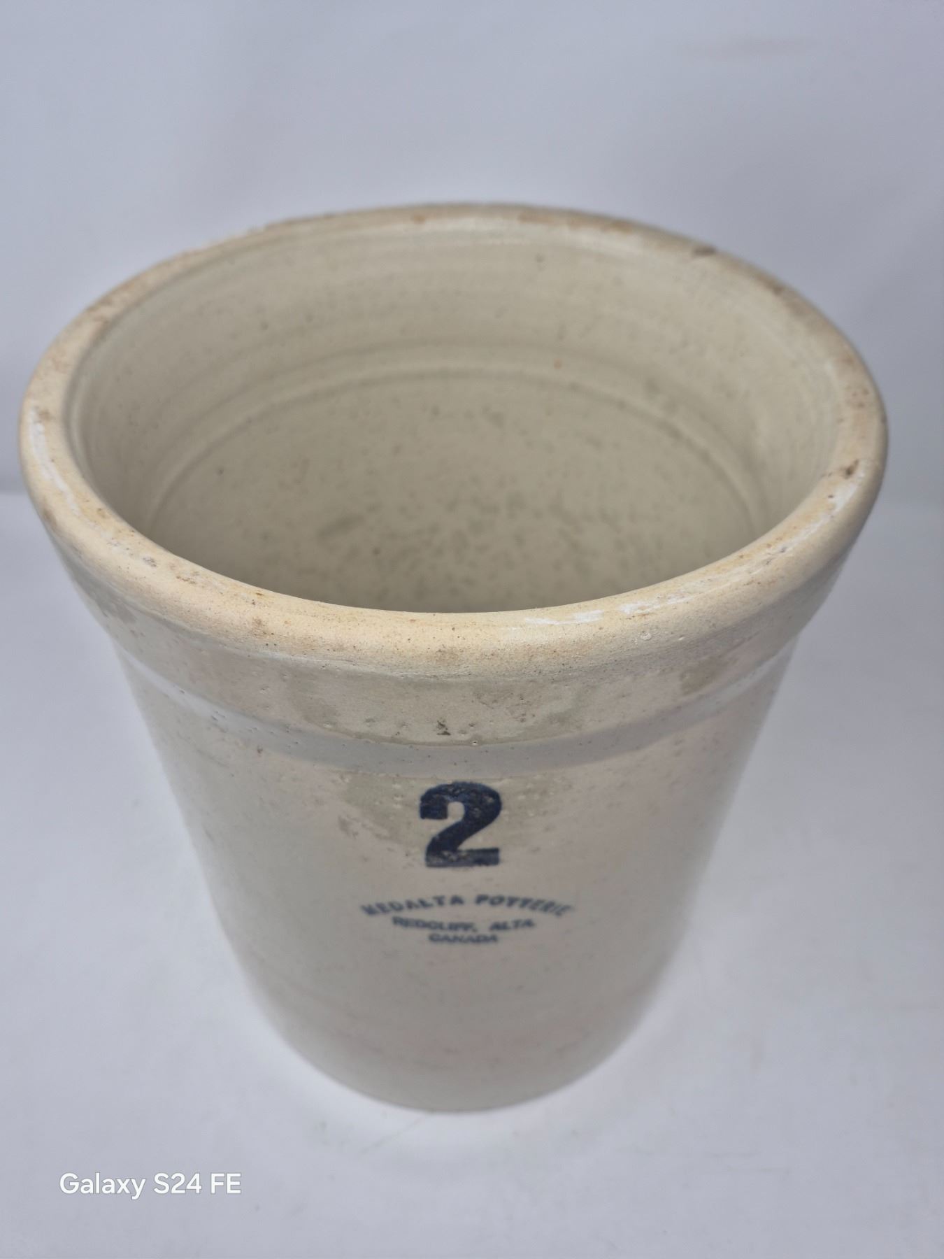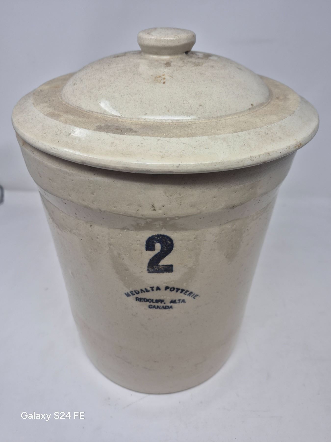 Classic Medalta Pottery 2-gallon stoneware crock from Redcliff, Alberta. Complete with matching lid—perfect for farmhouse decor or traditional kitchen use.