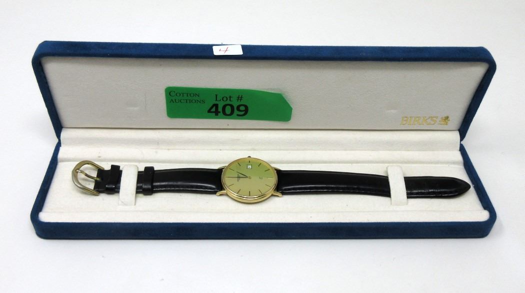 Unauthenticated. Leather Strap. Original receipt ($1250) and Birks Watch Box.