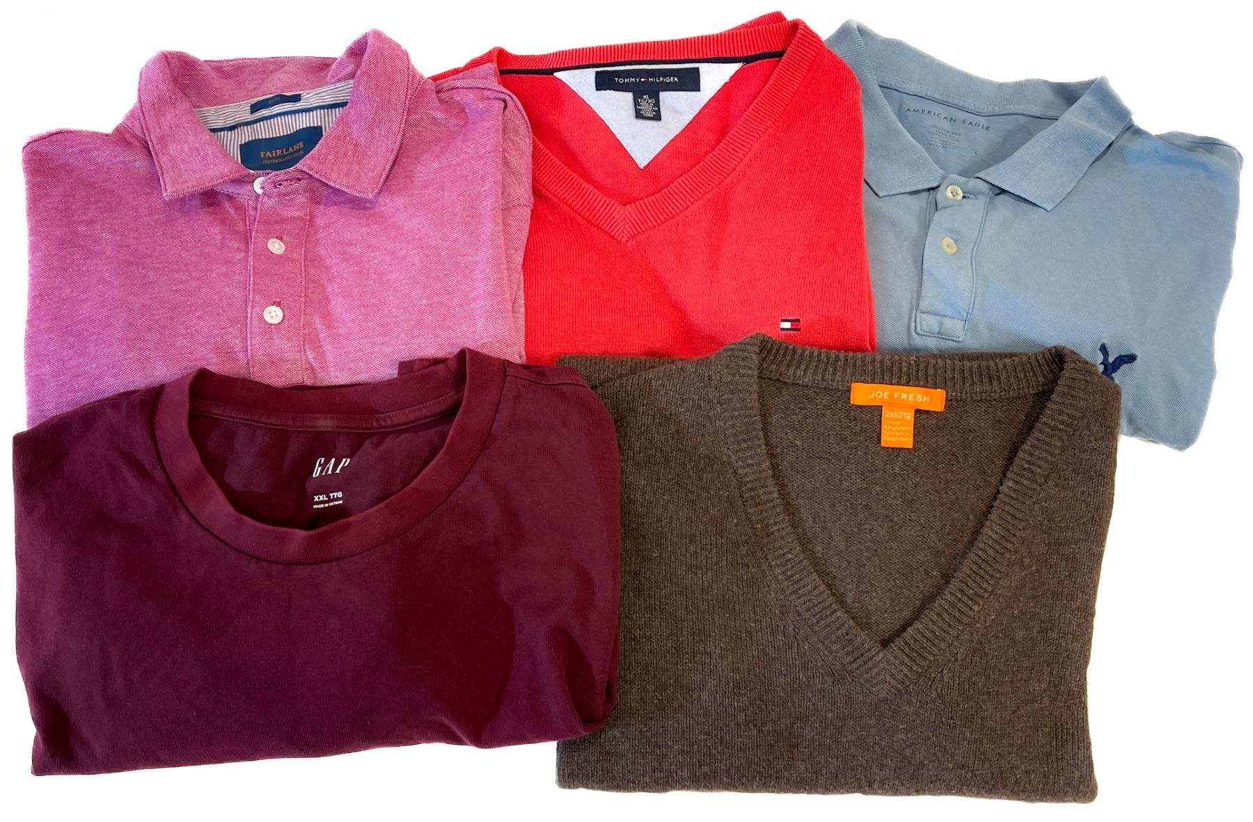 Mixed 5-piece lot of quality men’s tops in size 2XL, including brands Tommy Hilfiger, GAP, American Eagle, Joe Fresh, and Fairlane. Includes a mix of polos, sweaters, and long sleeve shirts. All in good used condition.