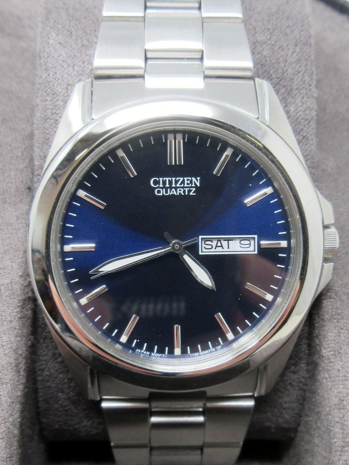 Dark blue face. Includes box, warranty card and $160 price tag on base. Never worn.