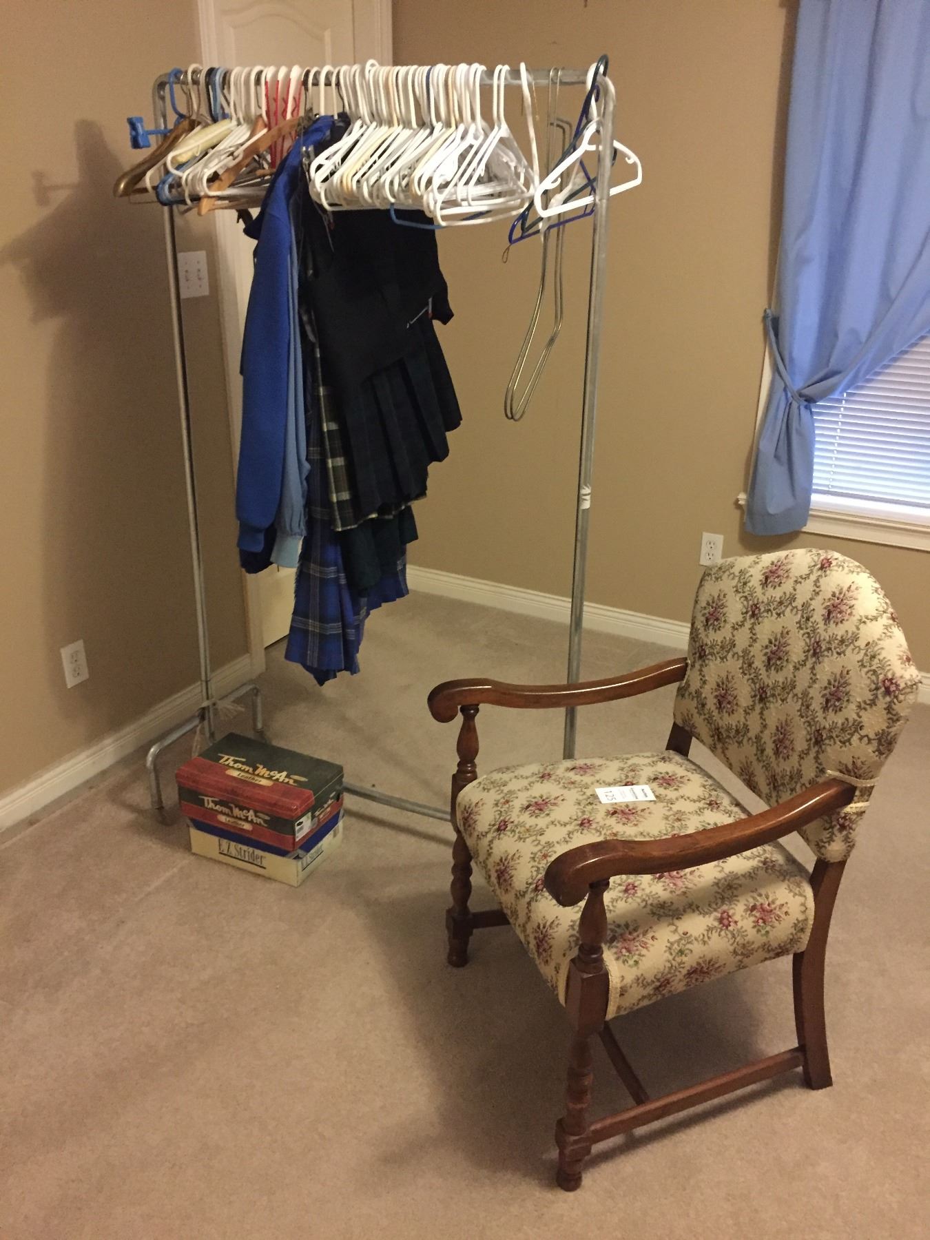 Lot includes 3 men's jackets, Woolen Kilts with vest size around 12, metal rolling clothes rack, Upholstered chair, hangers, 2 pairs of size 9 & 9.5 men's shoes look new in box. Come to pickup at Category A time slot, (9:00 am - 10:00 am)