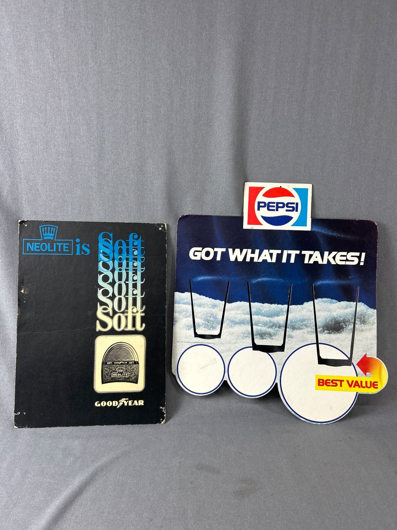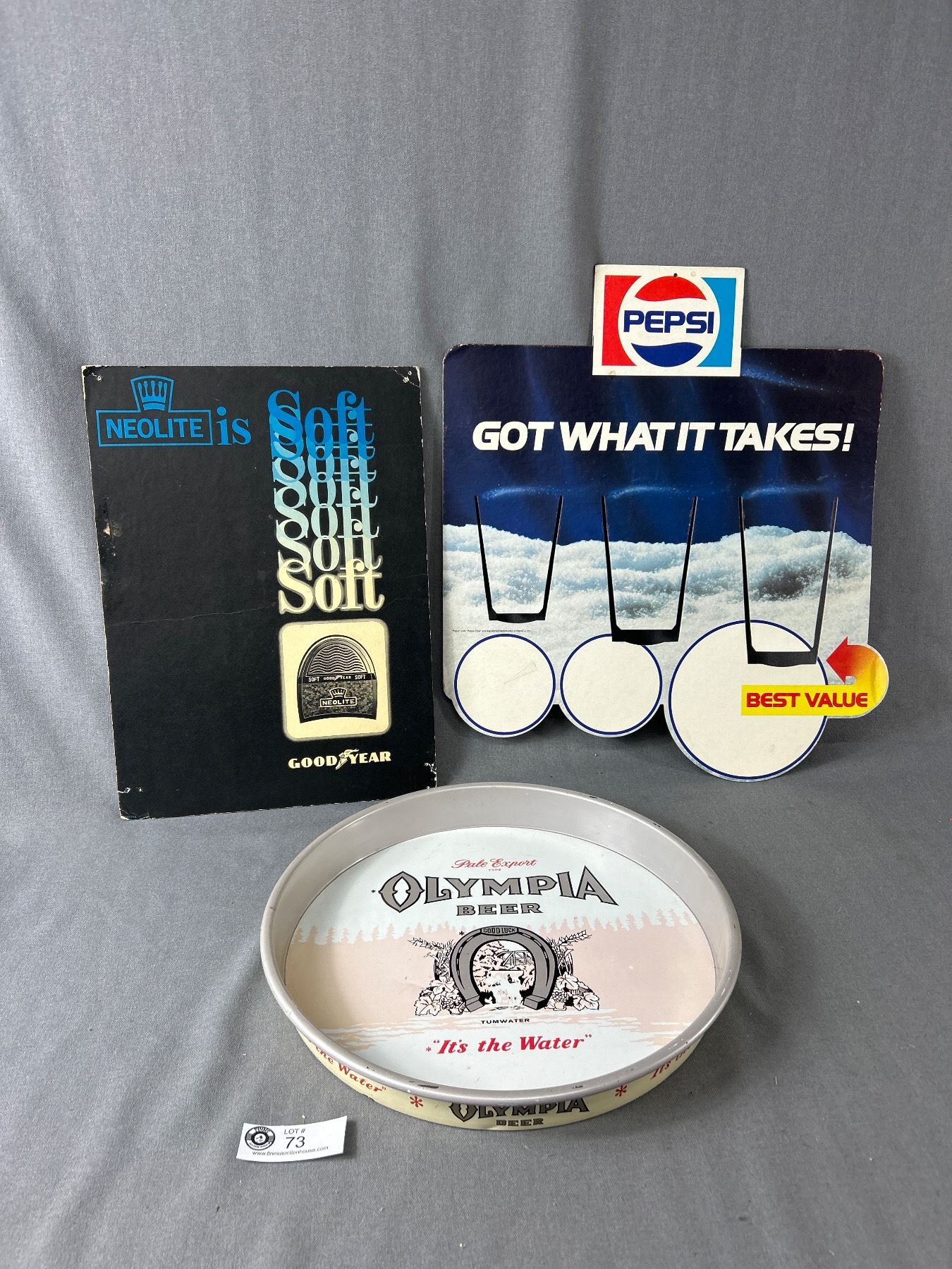 Metal Olympia Beer Tray & 2 Cardboard Signs - Pepsi & Neolite Goodyear
