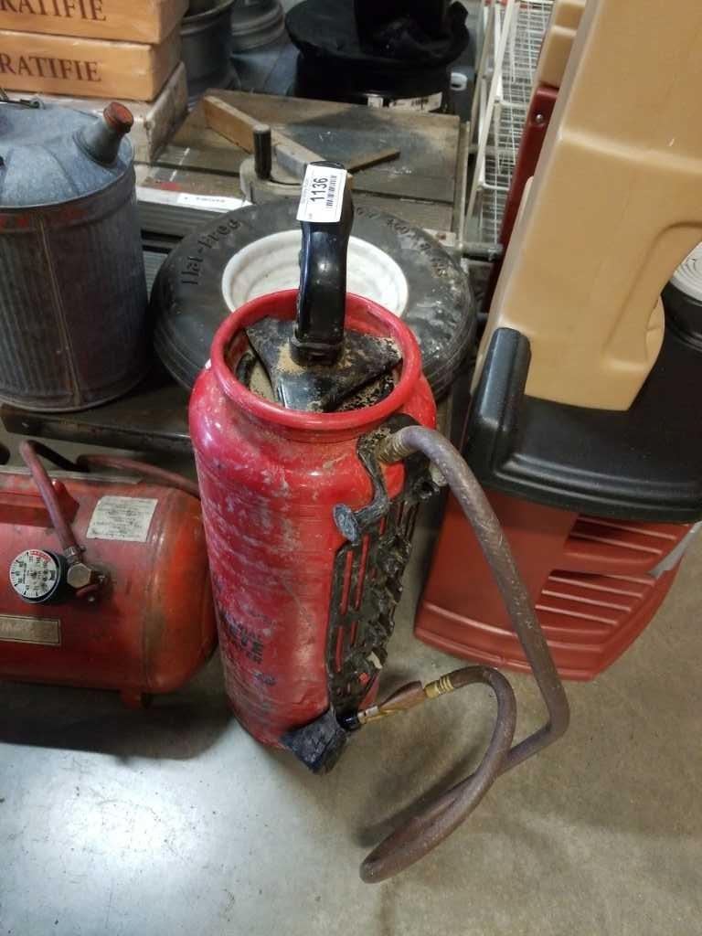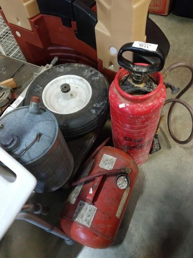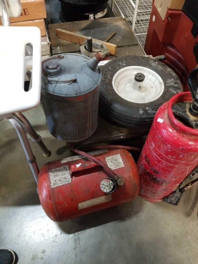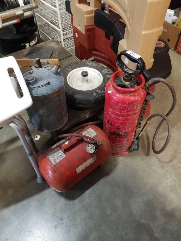 Metal cannister sprayer does hold pressure, portable air tank wheel barrow tire and galvanized can