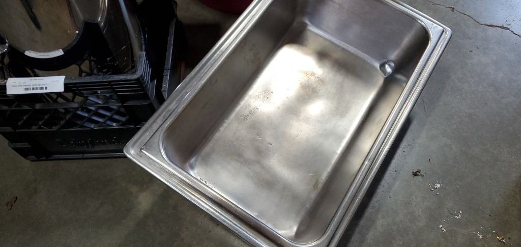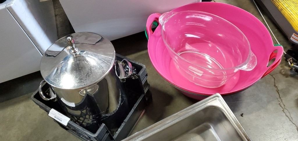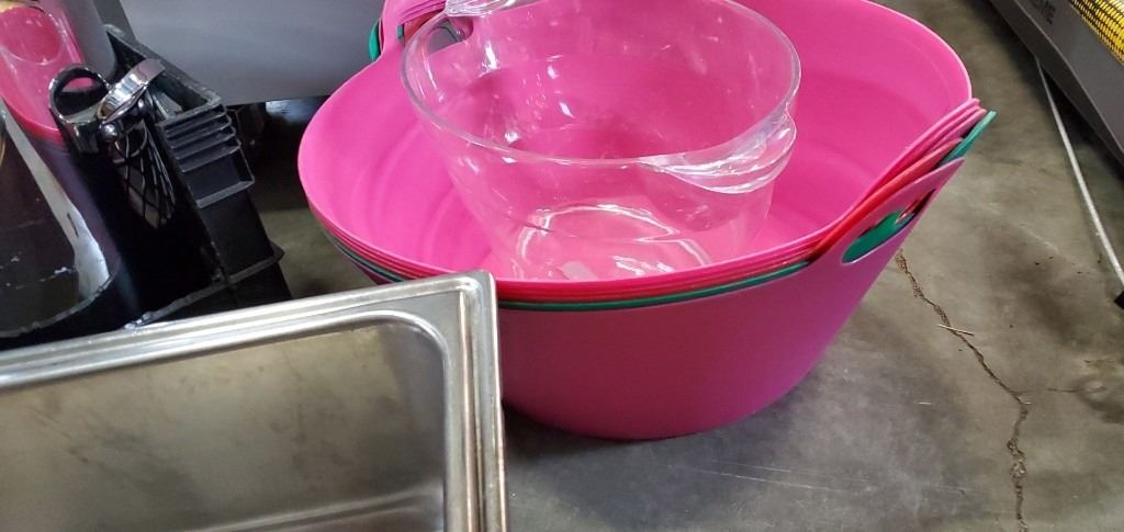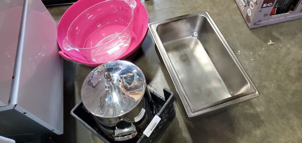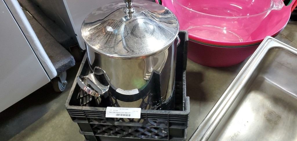 Metal coffee dispenser, plastic tubs and 2 stainless tubs
