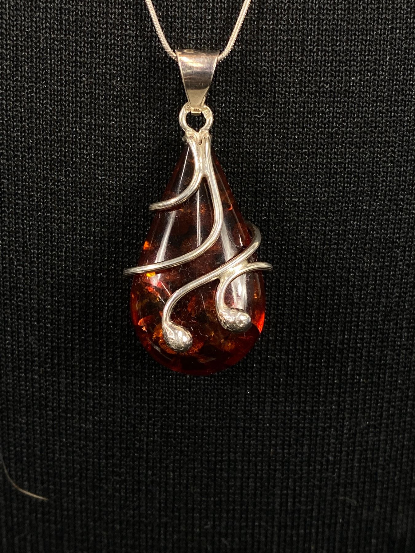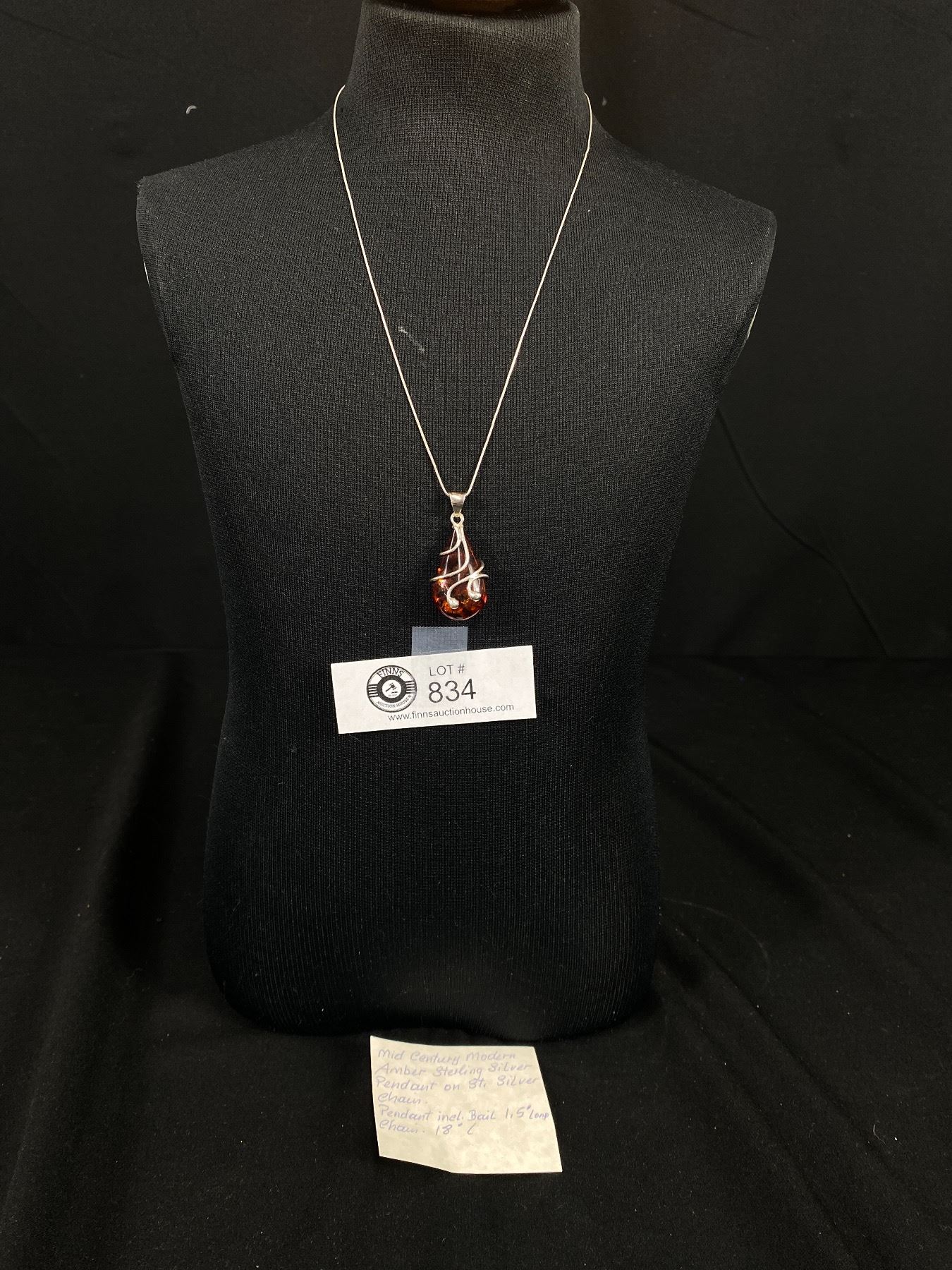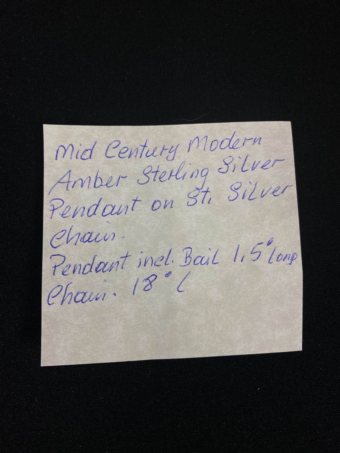 Mid Century Modern Amber Sterling Silver Pendant on Sterling Silver Chain 18" Length