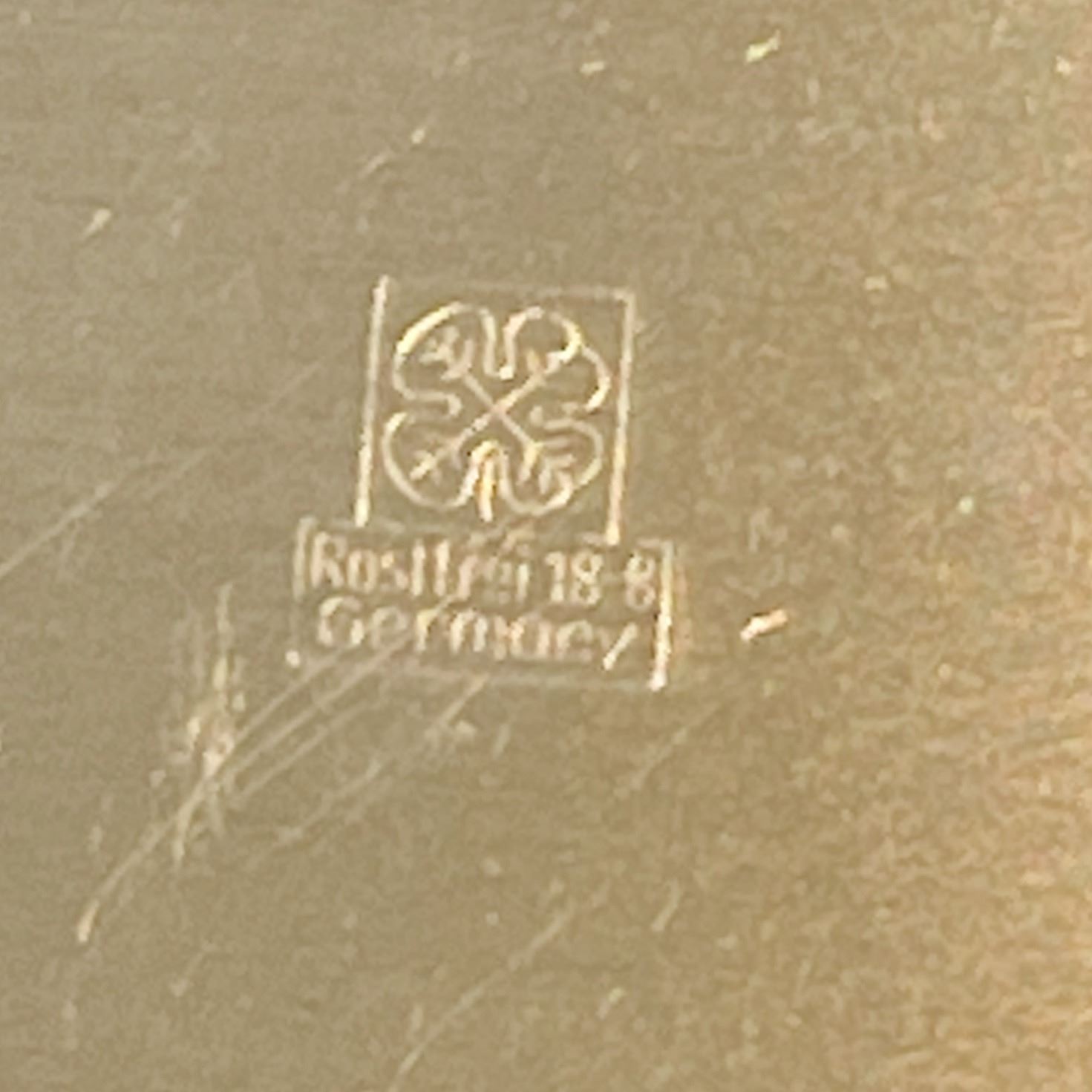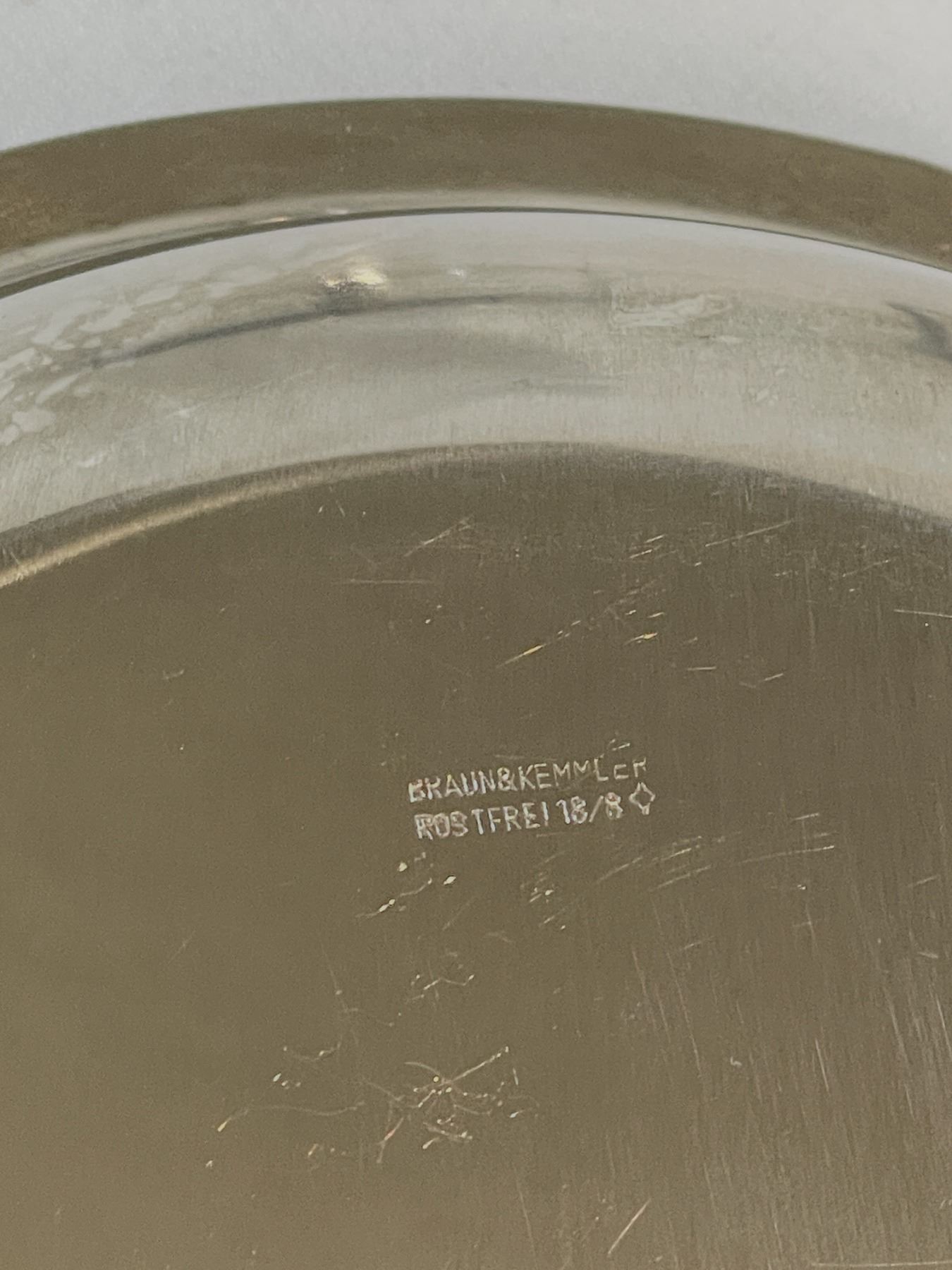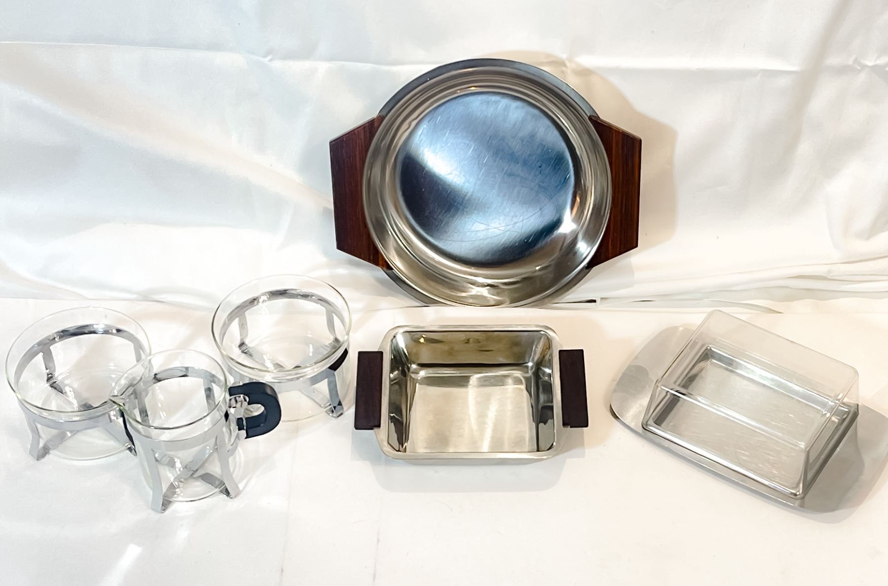Elegant MCM German stainless steel and glass set featuring a round bowl with rosewood handles, a small rectangular serving dish with matching wood handles, a covered stainless butter dish with clear acrylic lid, and a three-piece cream and sugar set (two small glass bowls and a matching creamer) in stainless steel holders. All pieces showcase clean Bauhaus-inspired lines and warm wood accents, blending function and timeless design. Light vintage wear consistent with age.