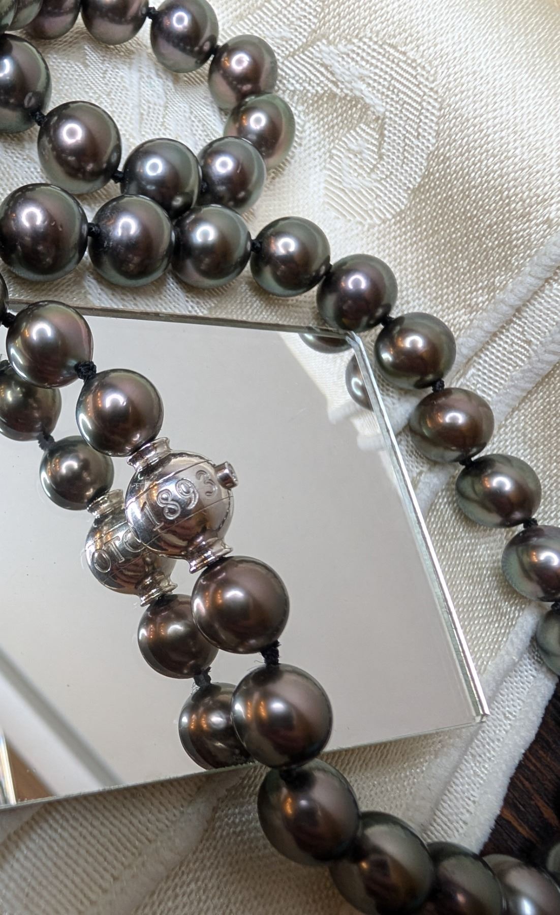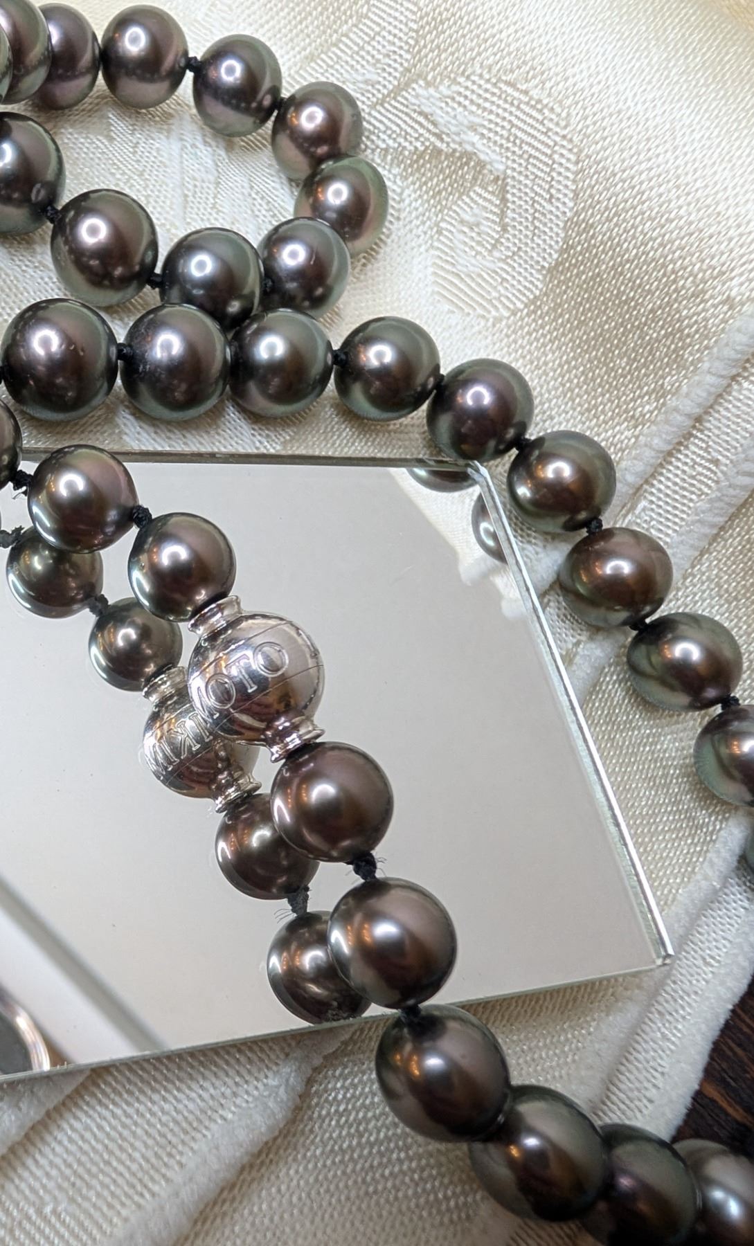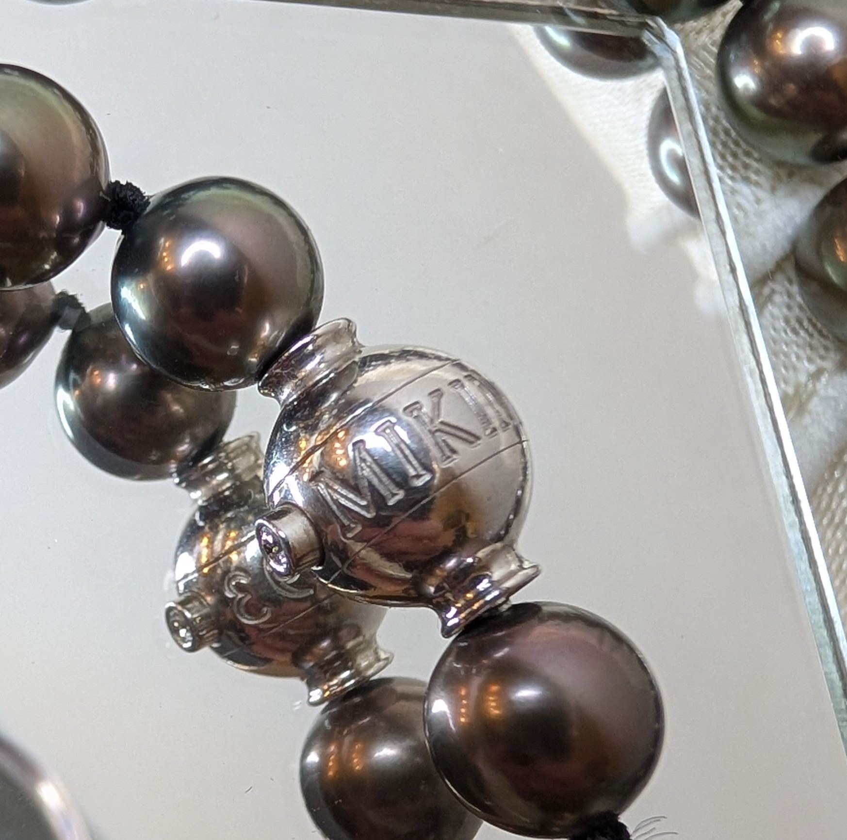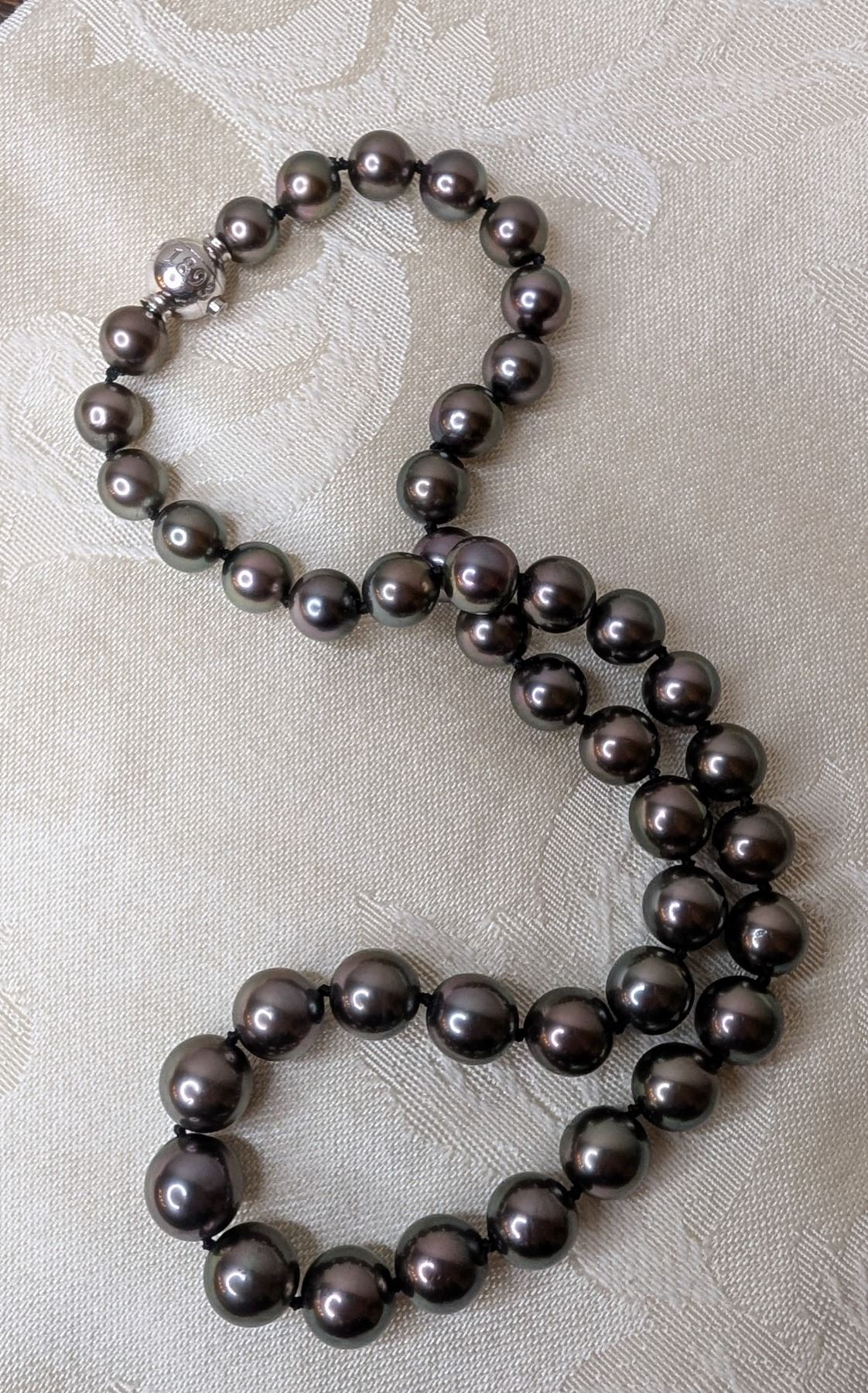 Mikimoto luxurious strand of black pearls silver tone clasp replacement value $24,000