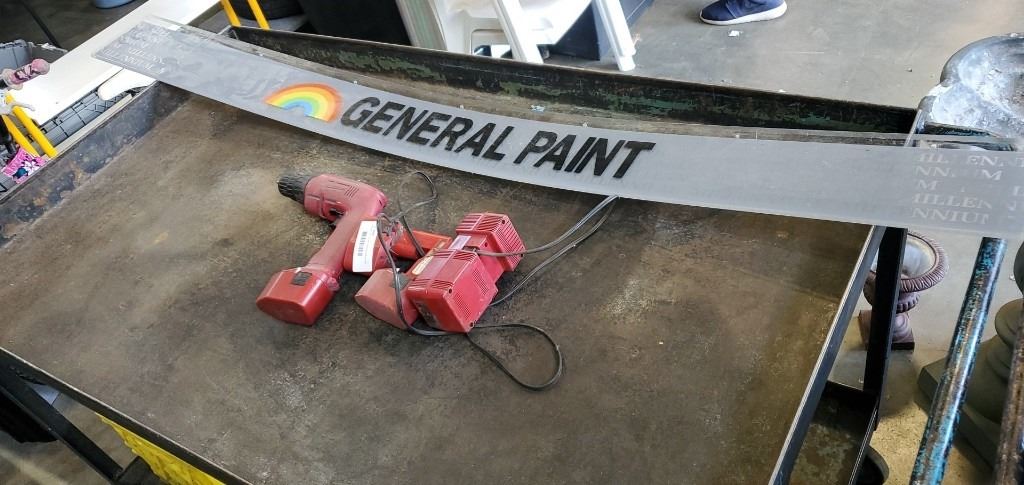 Milwaukee drill, charger, 3 batteries and general paint sign