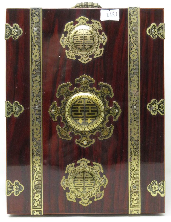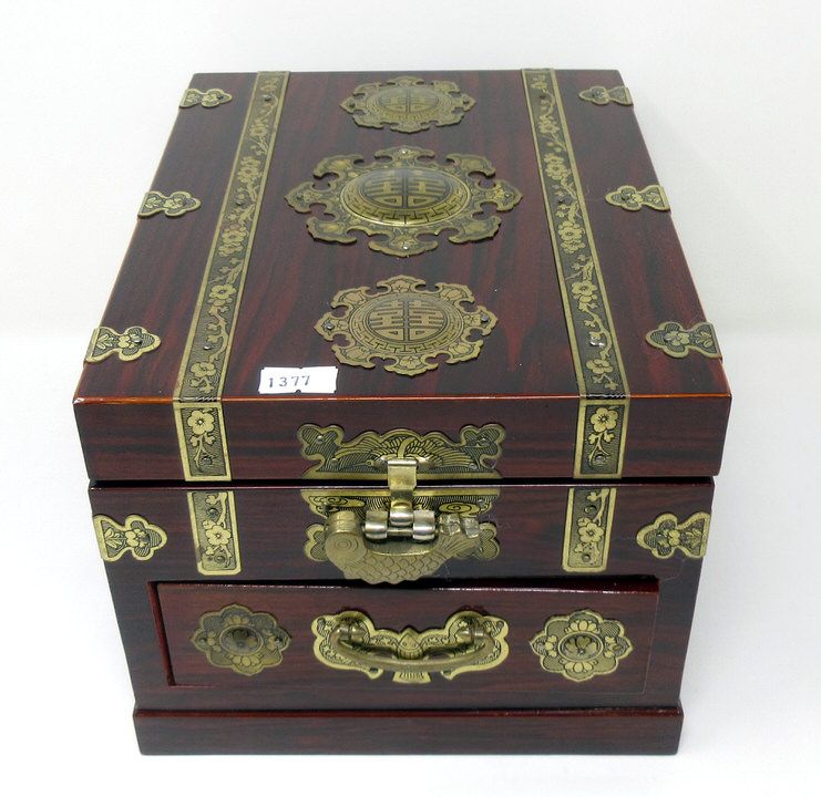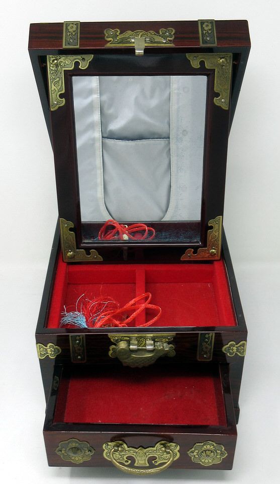 Sectioned top with fold out mirror and one drawer in the base. Very nice condition. 7.5" wide x 9.5" deep x 7" tall (when closed).