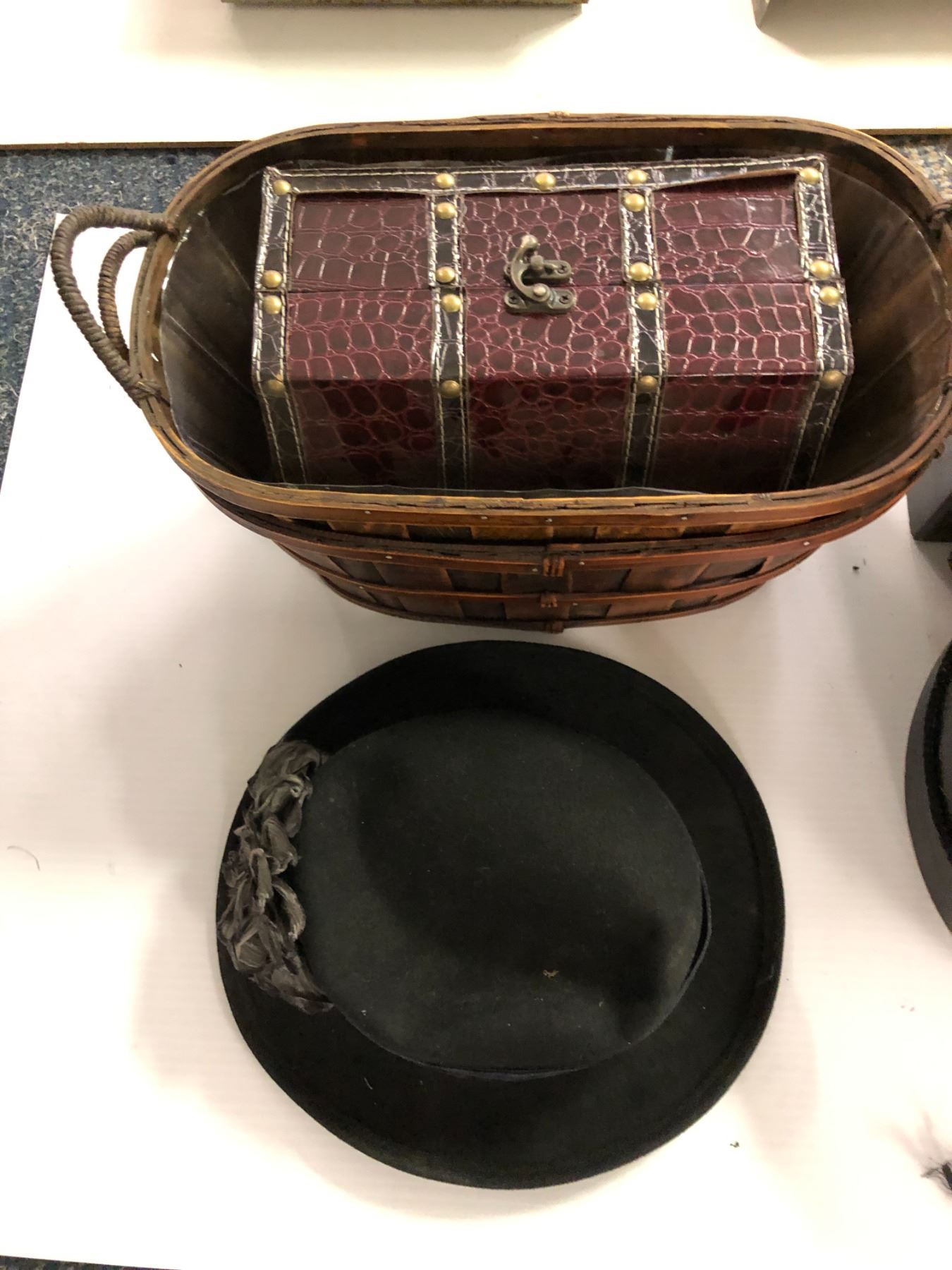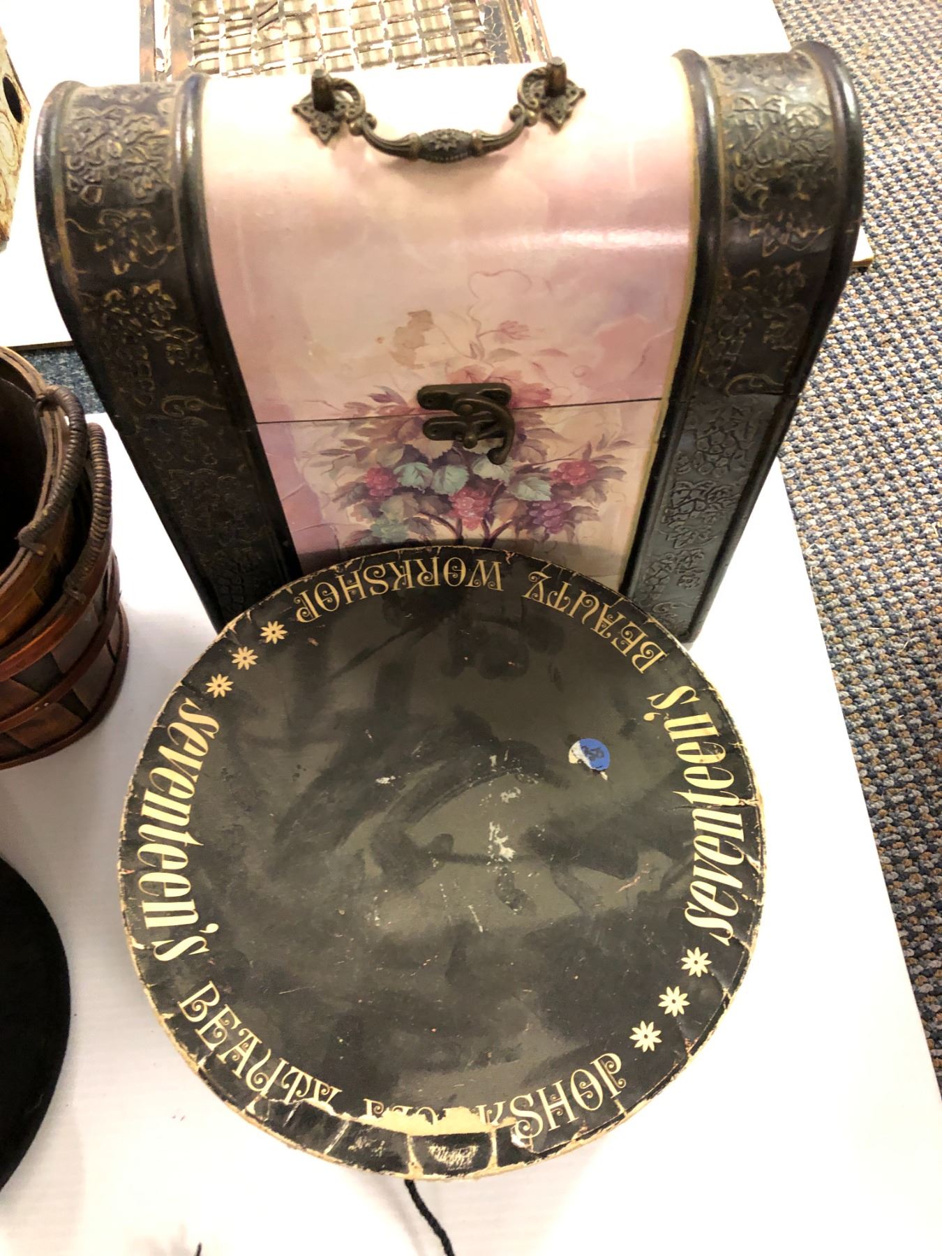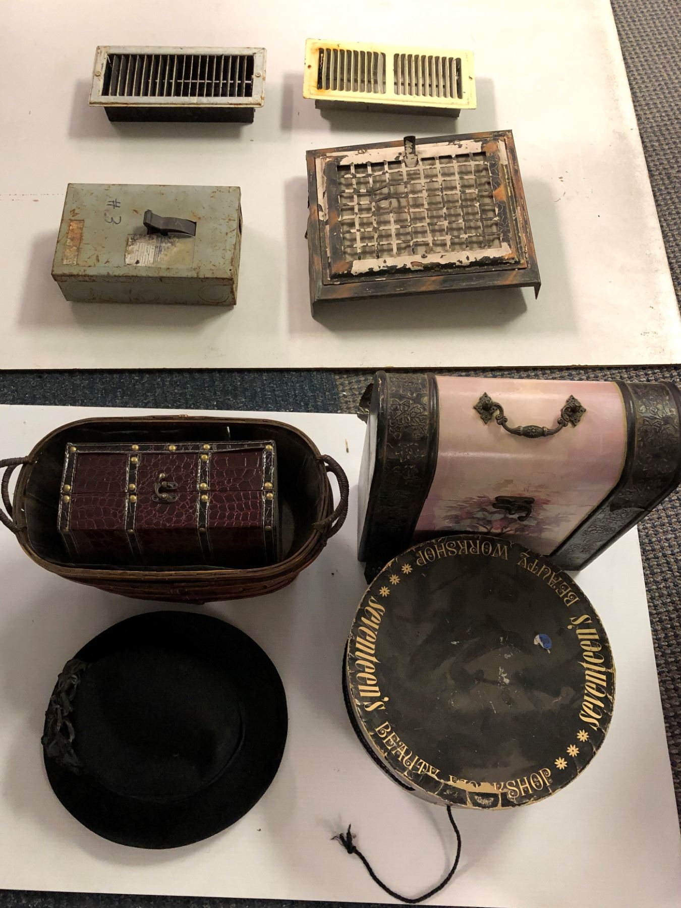 Misc Collection of Hat, Hat Box, Baskets, Antique Vent Cover, Baskets and Treasure Chests.