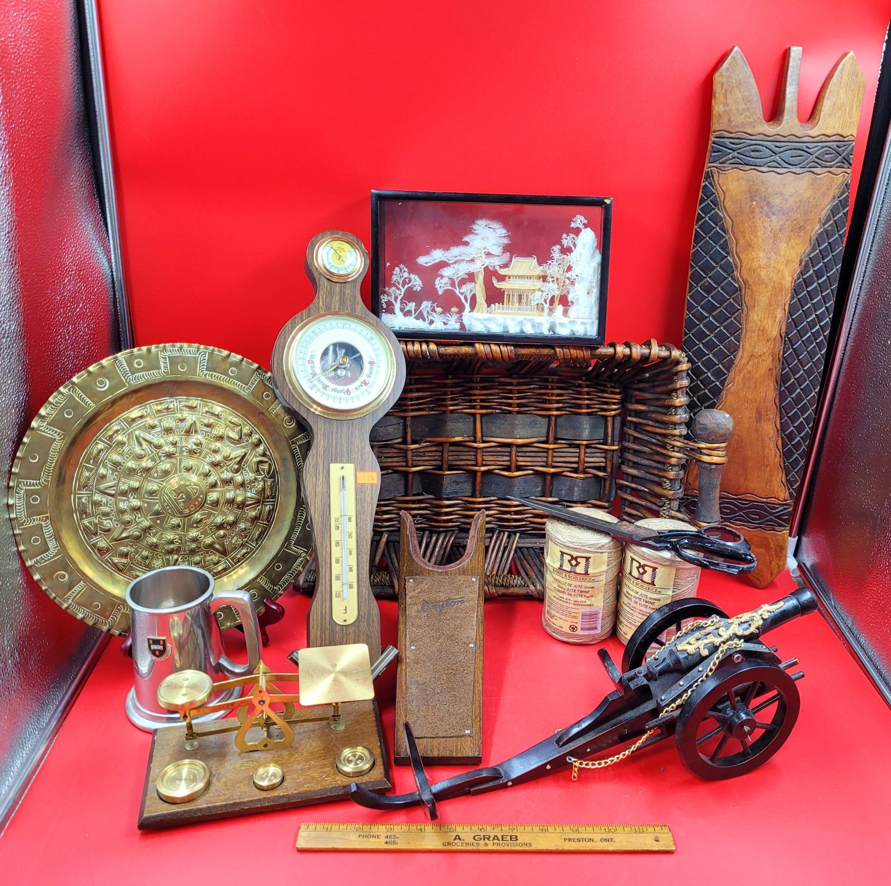 Misc. VTG Lot Including Brass Plate, Scale, & Canon Décor