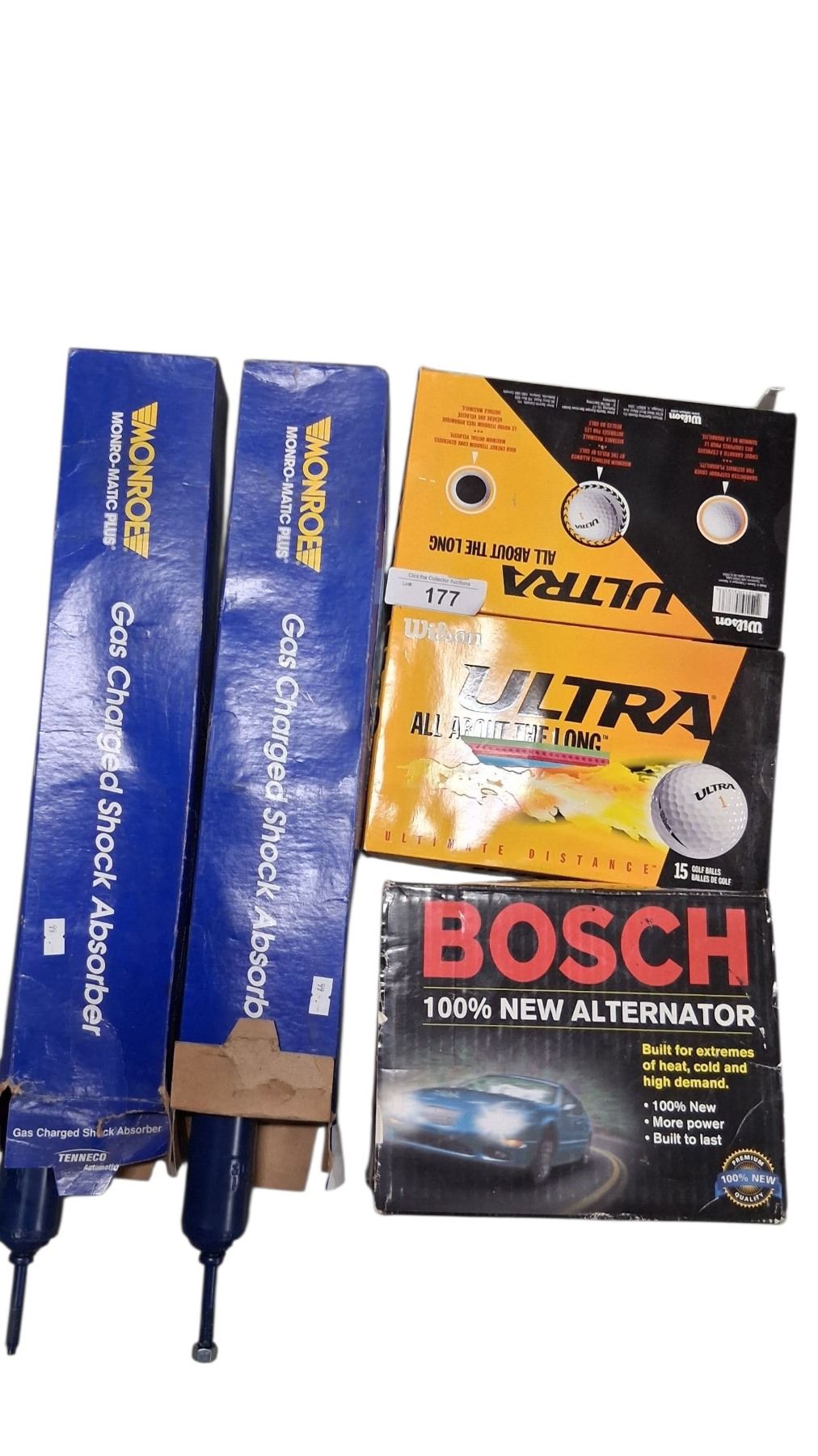 Misc lot inc Bosch alternator, shock absorbers, & 2 boxes of NIB golf balls
