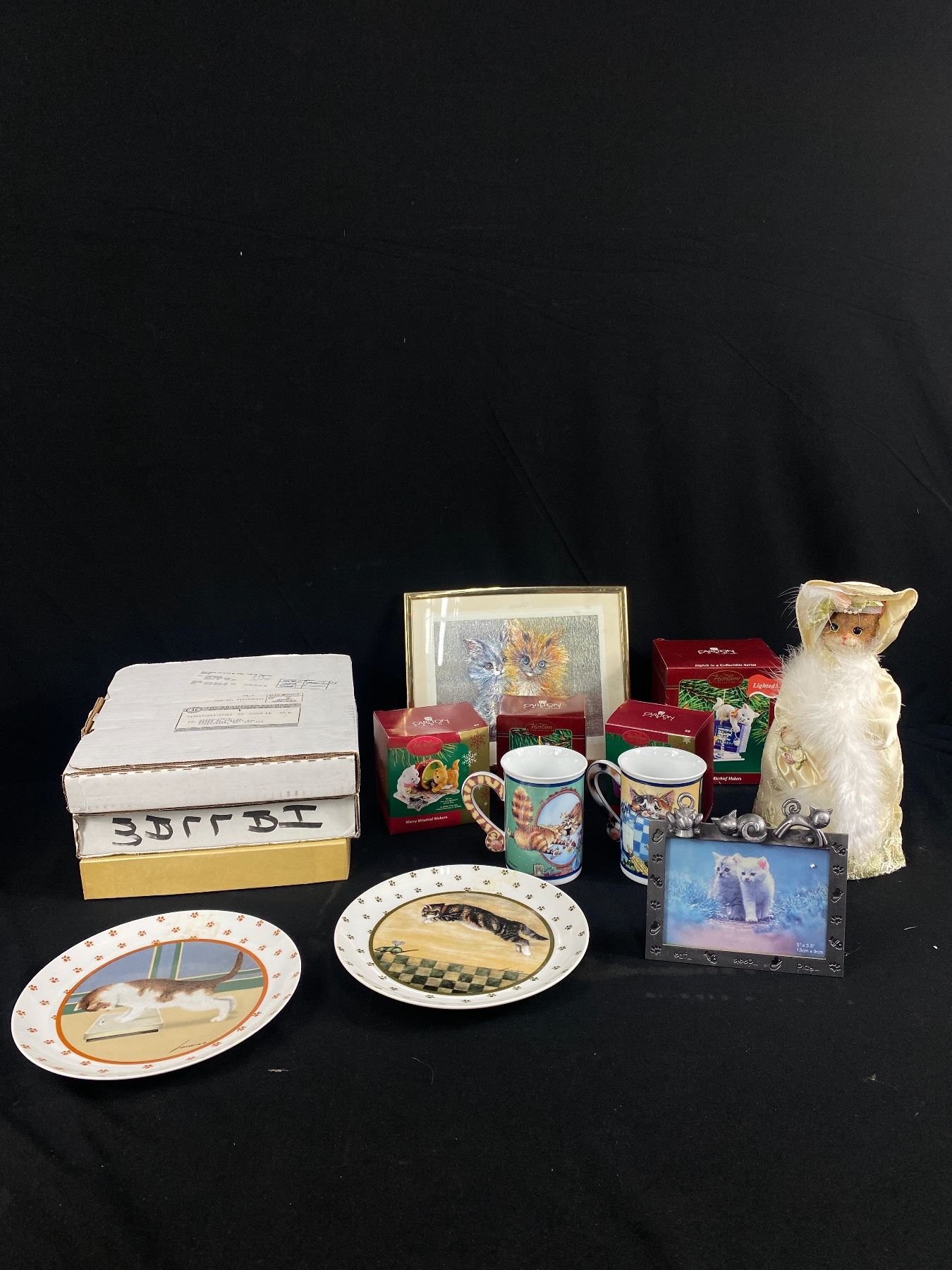 Miscellaneous Collectible Cat Lot. Figuriens, Plates, Christmas Decorations Etc
